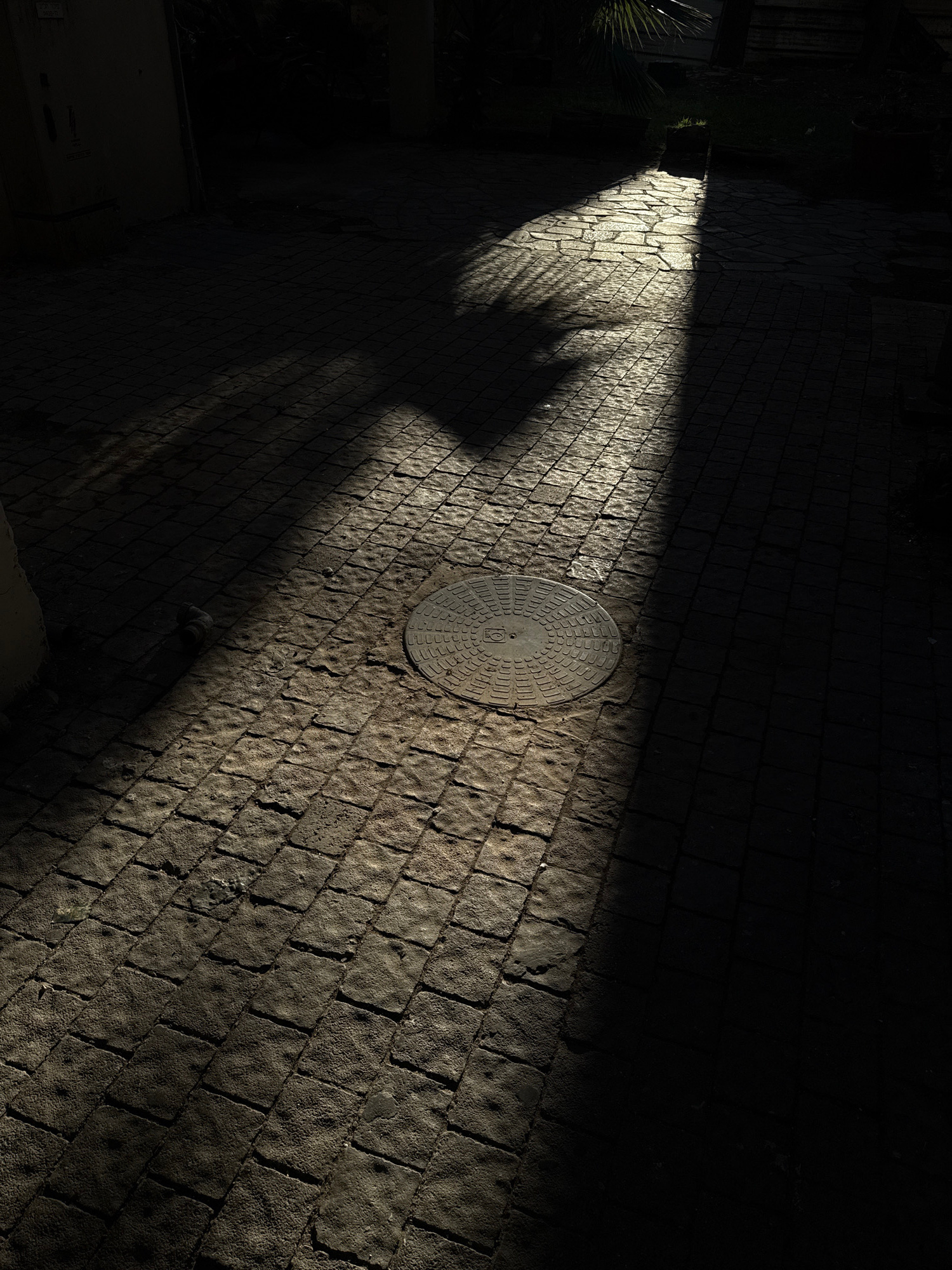 The image depicts a dimly lit cobblestone street in Tel-Aviv, Israel. A round manhole cover is located centrally in the illuminated portion of the street. The cobblestones are dark gray and textured.…read more