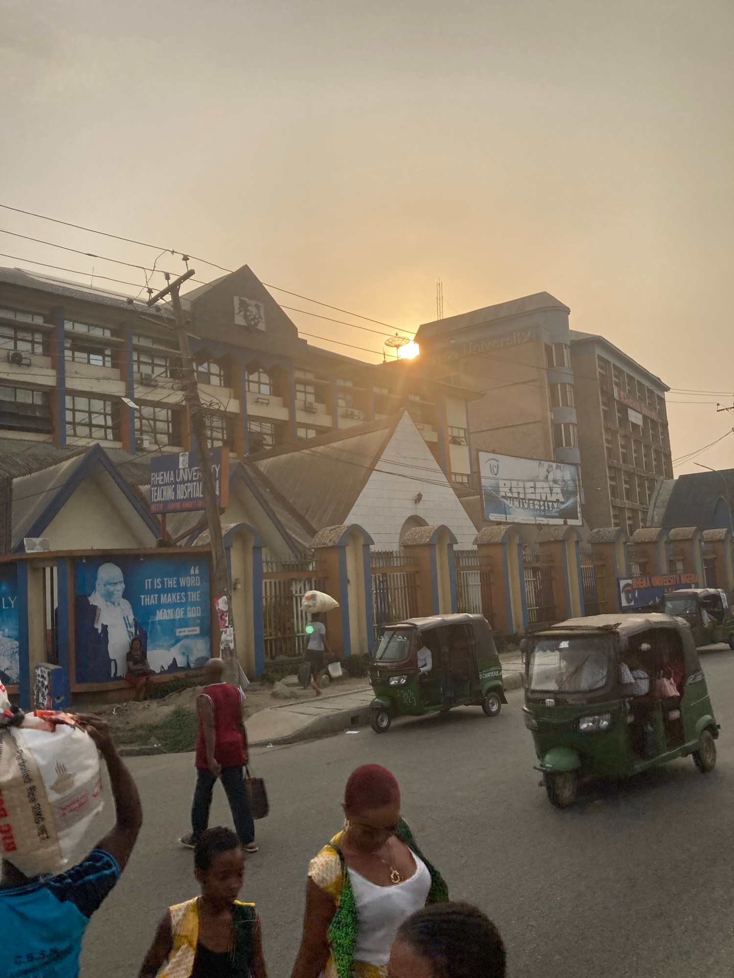 The image captures a street scene in Aba, Nigeria, prominently featuring Rhema University Teaching Hospital buildings. The buildings are multiple stories high, constructed in a combination of concrete…read more