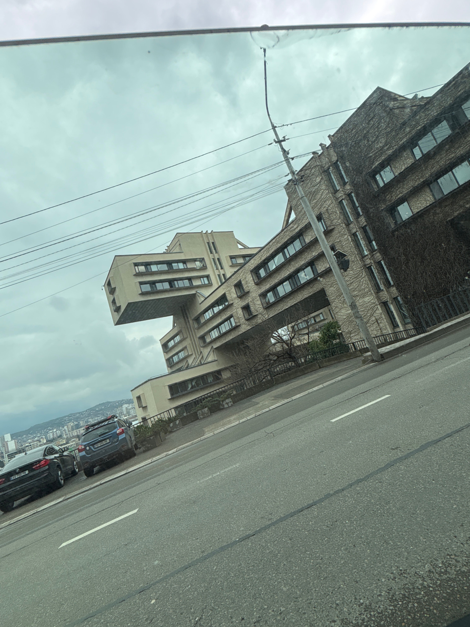 The image captures an urban street scene in Tbilisi, Georgia, featuring the Bank of Georgia Headquarters on Gagarin Street under an overcast sky. The foreground shows a grey asphalt road with a white…read more