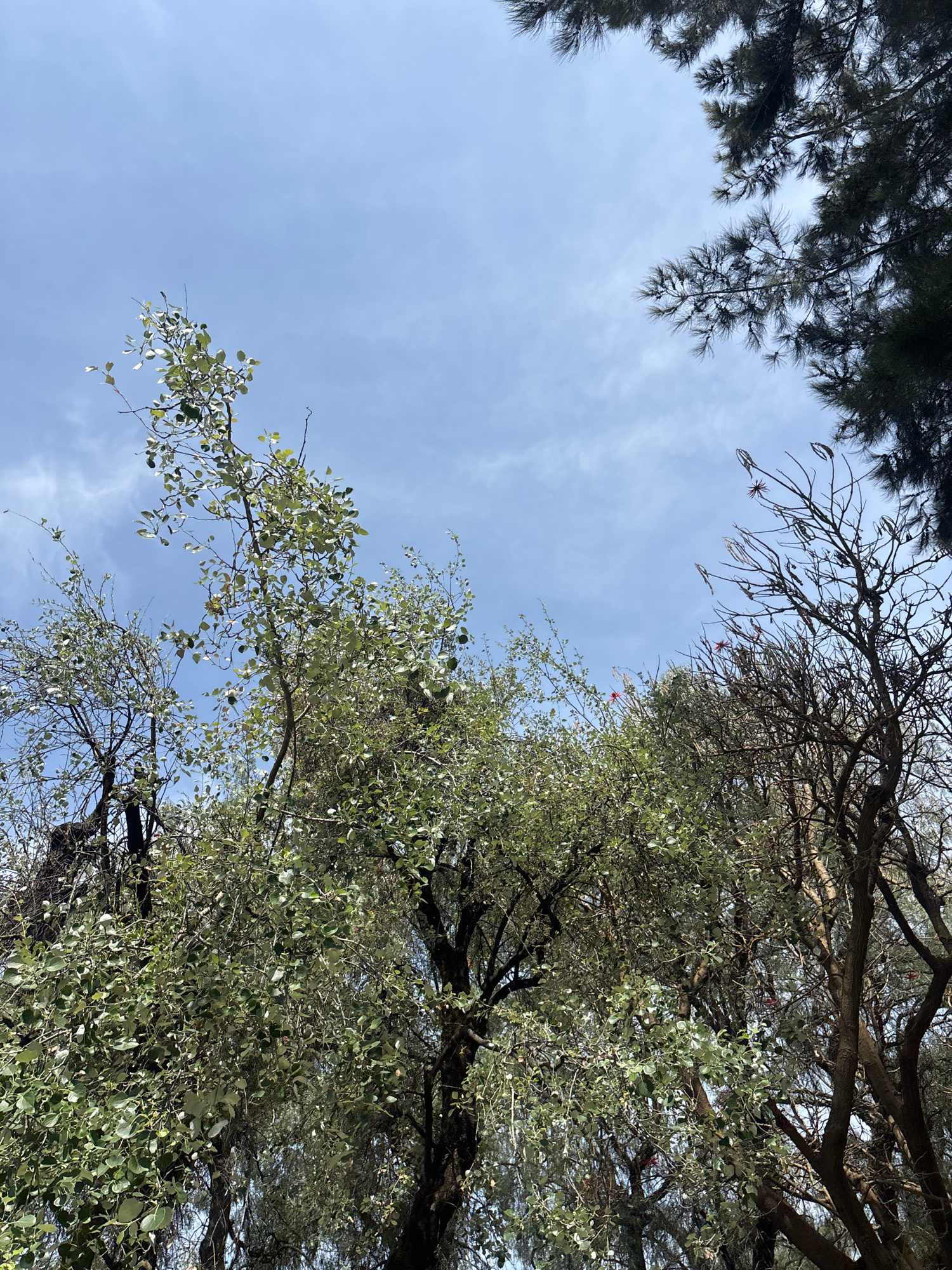 Looking up at the sky in San Andrés Cholula, Mexico, the view is framed by trees. On the upper left is a dark green tree with needles. On the right are trees with light green leaves. The sky is a ligh…read more