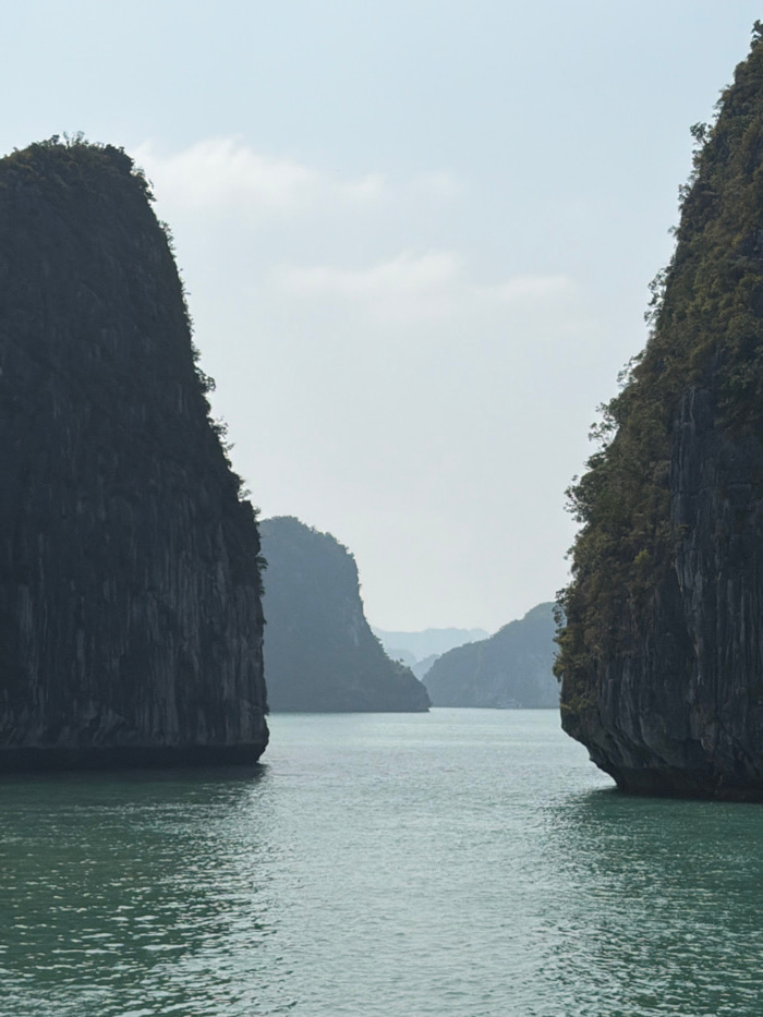 Captured is a landscape featuring towering rock formations vegetated with greenery. The rocks meet a body of water with rippling surface, suggesting slight movement. In the distance, silhouetted mount…read more