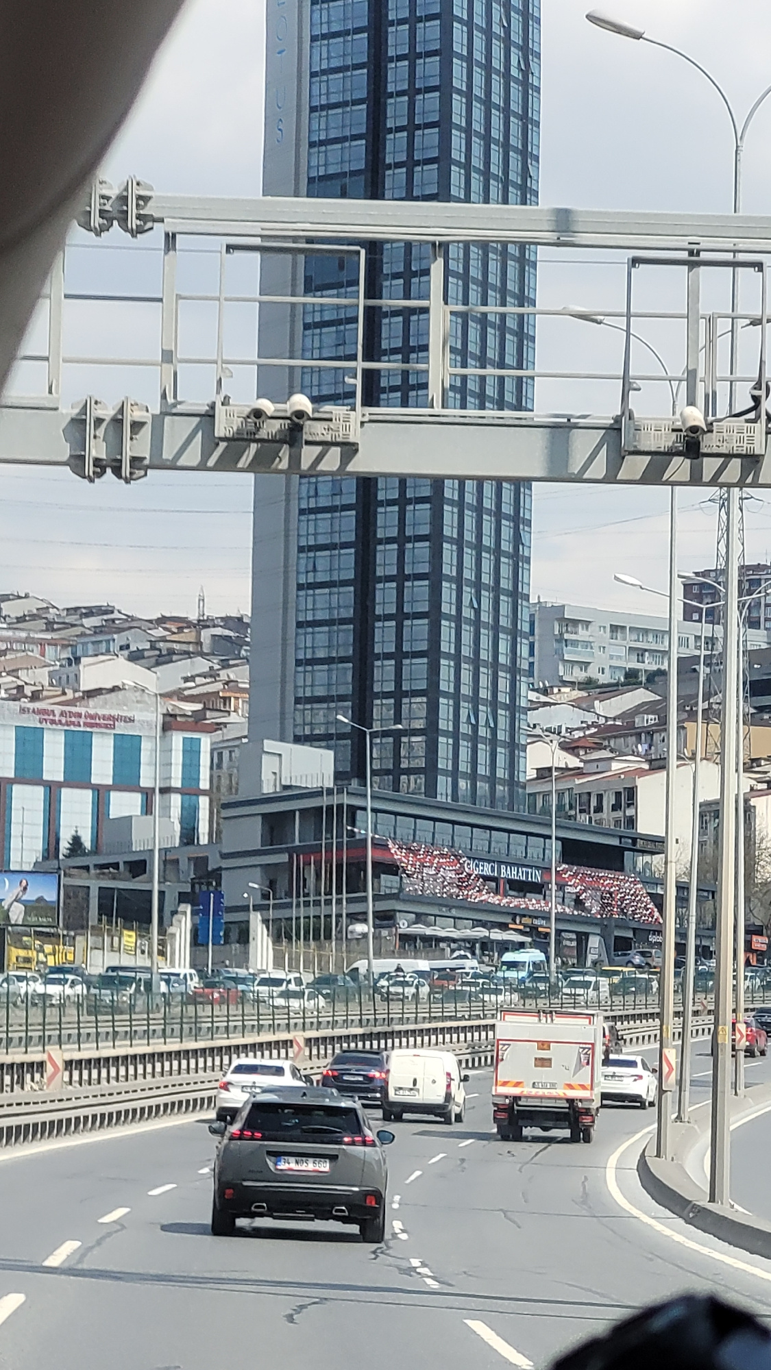 The image depicts an elevated view of a highway in Esenyurt, Turkey, with traffic moving along several lanes. A tall, modern building with a glass facade is visible to the left of the highway. An over…read more