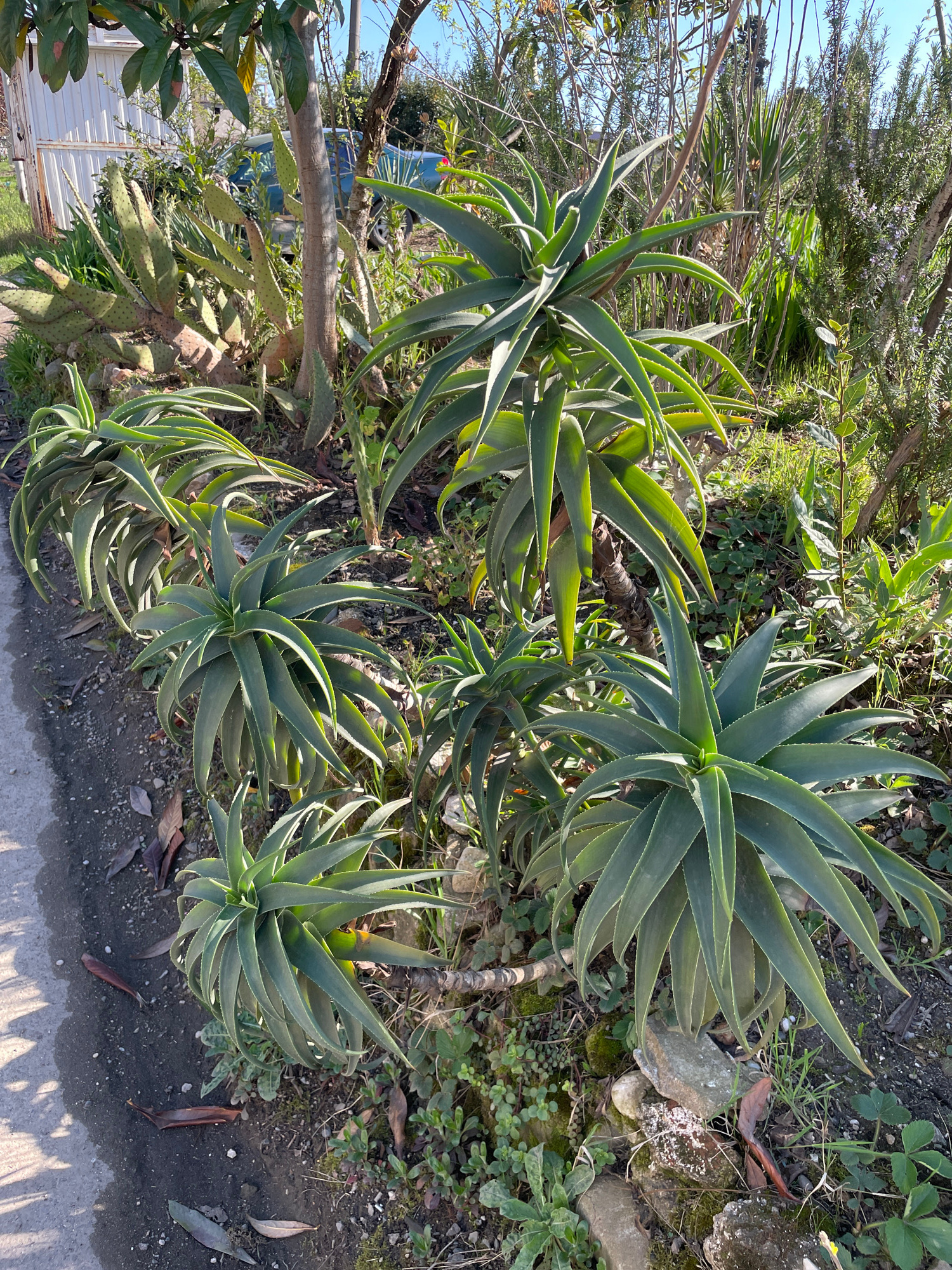 The image shows a cluster of Aloe plants growing in what appears to be a garden bed or landscaped area. The plants have thick, fleshy leaves with serrated edges, characteristic of Aloe species. The gr…read more