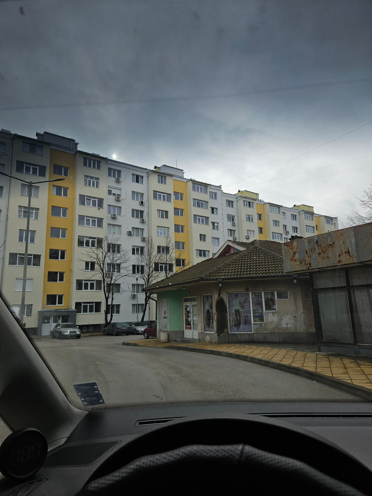 The image, taken from inside a vehicle, shows a multi-story apartment building in Haskovo, Bulgaria. The building has a yellow and white facade and numerous windows with air conditioning units attache…read more