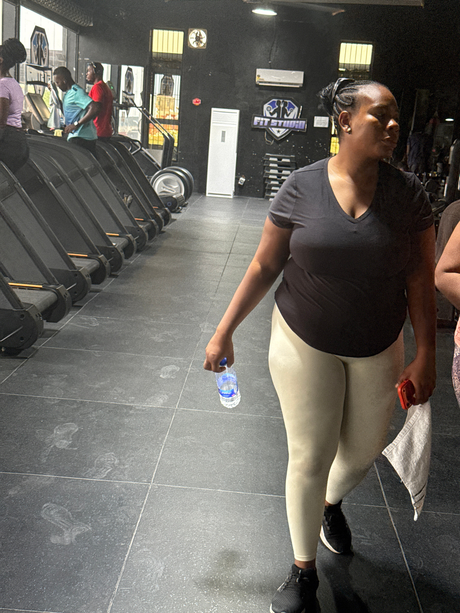 The image depicts a woman in a black top and light-colored leggings standing in what appears to be a gym. She holds a water bottle in one hand and a phone/towel in the other. She is wearing black snea…read more