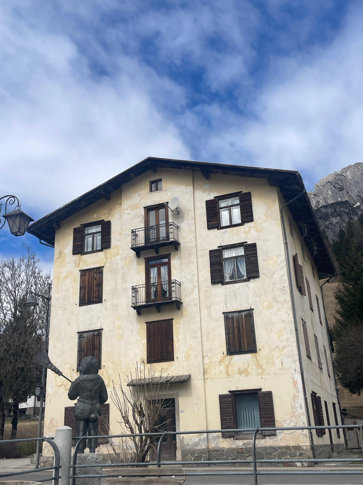 The image captures a tall, narrow building in Sappada / Plodn / Sapade, Italy. The structure features multiple stories, each adorned with rectangular windows framed by dark brown wooden shutters. Some…read more