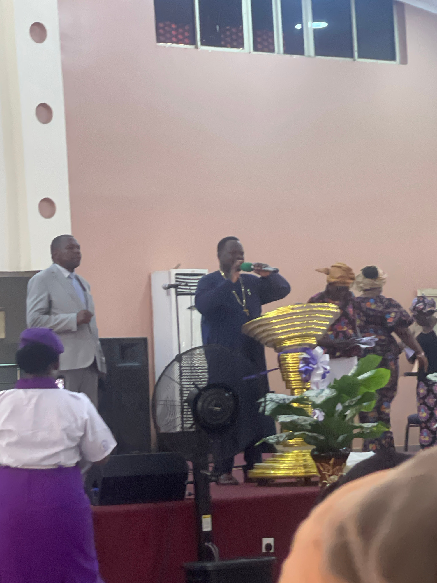 The scene appears to be inside a building in Kubwa, Nigeria. A man in a dark blue suit is holding a microphone and addressing a group of people. Behind him are two women in traditional clothing and a…read more