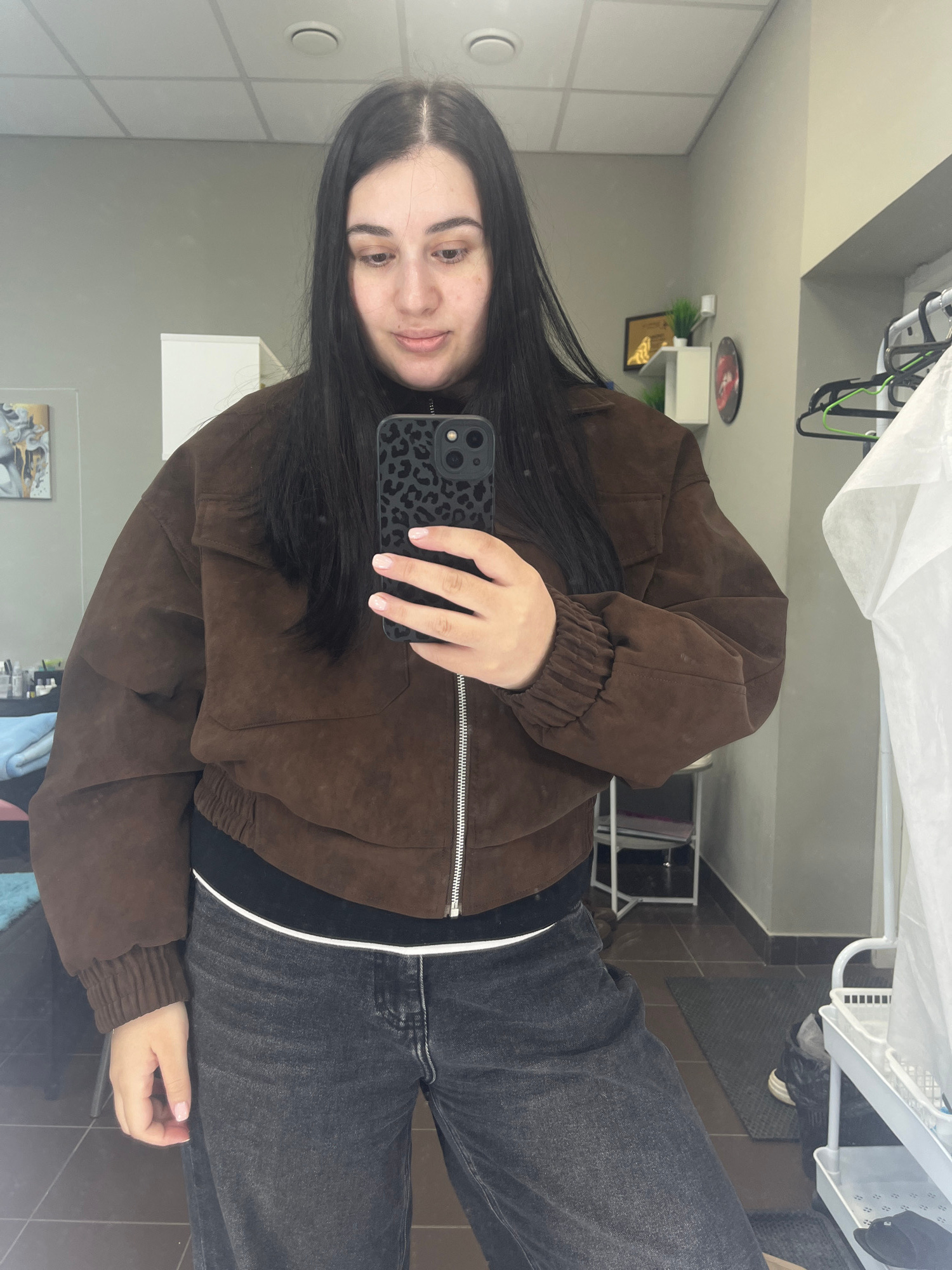 A young woman is captured in a mirror selfie, her reflection filling the majority of the frame. She has long, dark hair, fair skin, and dark eyes, and is looking directly at the camera with a slight s…read more