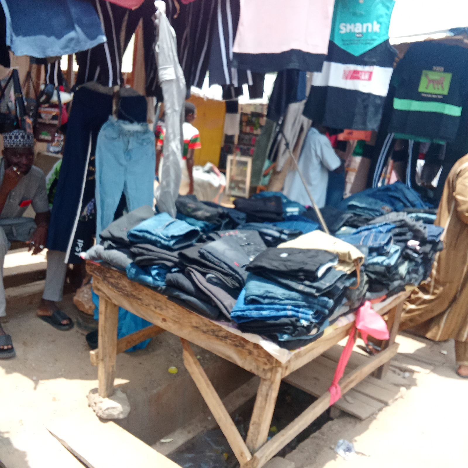 The image depicts a street market scene in an unidentified city. A wooden table is piled with stacks of folded jeans in various shades of blue and black. Clothing, including shirts and pants, hang ove…read more