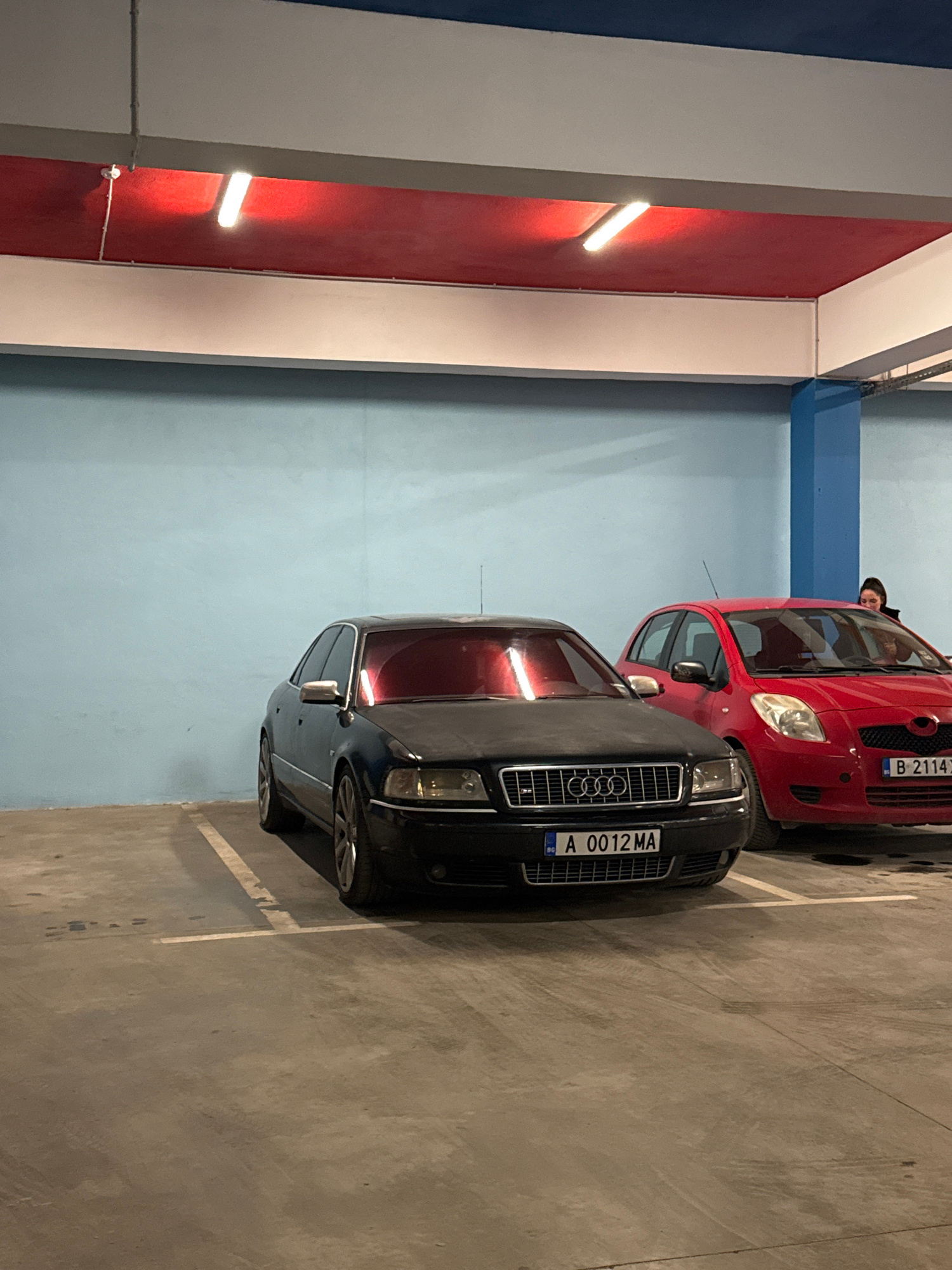 The image shows an indoor parking garage, likely in Varna, Bulgaria, containing two cars. One car is red with license plate "B-2114", and the other is a dark colored Audi with license plate "A 0012 MA…read more