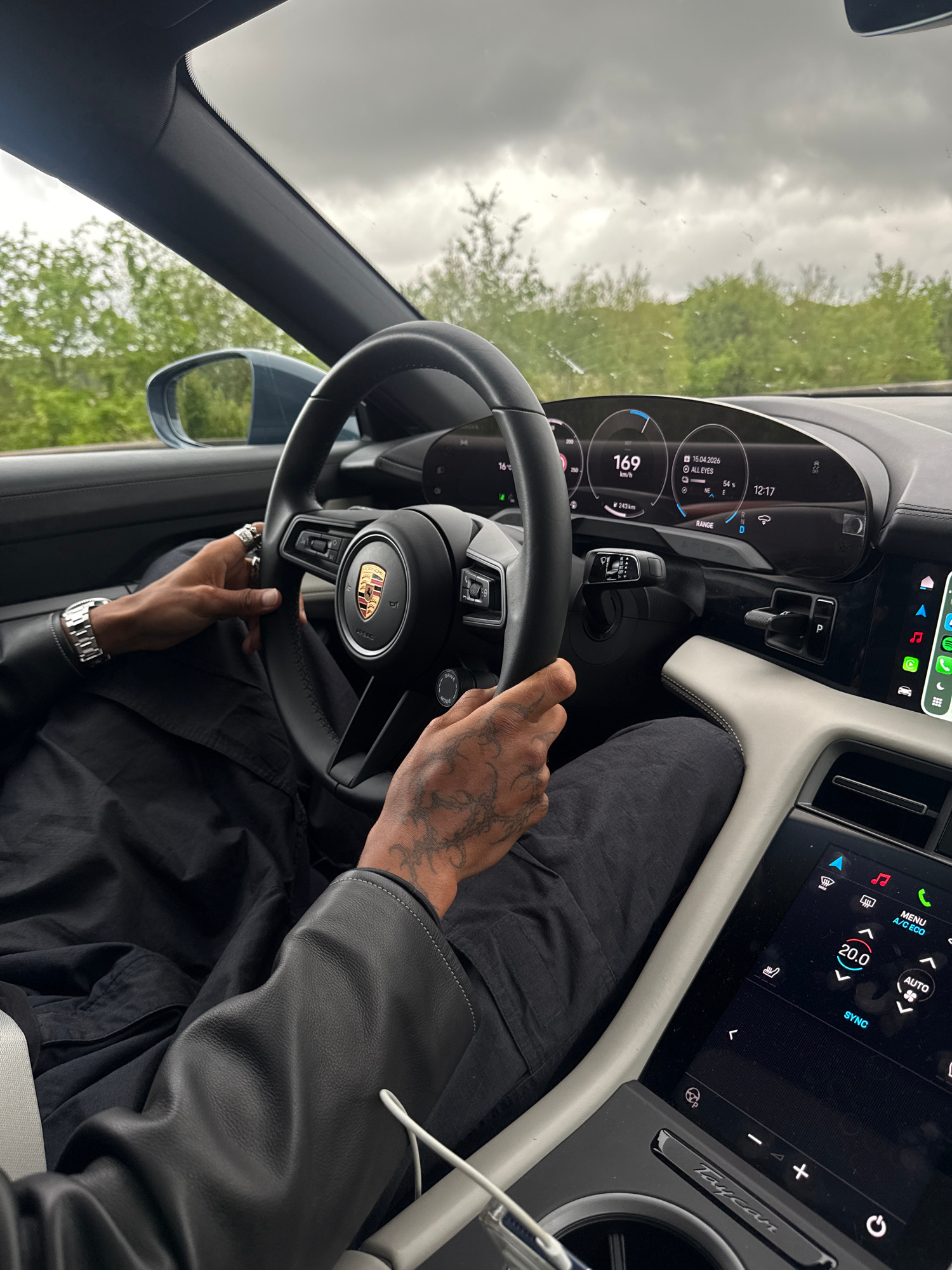 The image shows the interior of a Porsche Taycan, with the driver holding the steering wheel. The driver's hands are visible, adorned with tattoos and rings, and a watch on the left wrist. The car's dā¦read more