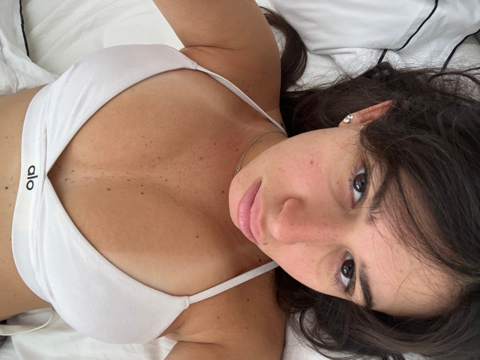 A female individual is depicted in a close-up, top-down perspective, lying on white bedding. She wears a white sports bra, featuring the vertically oriented 'alo' brand logo on the left breast area. T…read more