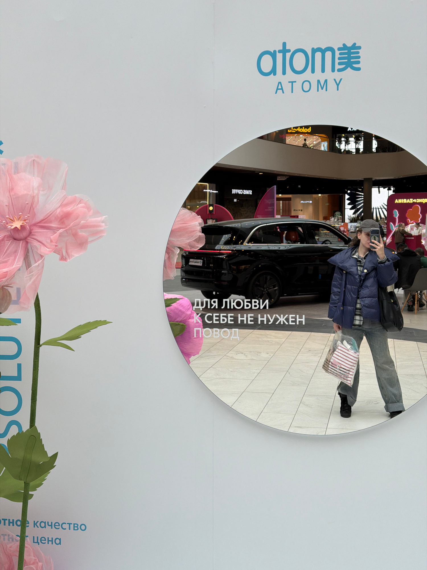 The image shows a marketing display for "atom美 ATOMY." The display includes the slogan, "ДЛЯ ЛЮБВИ К СЕБЕ НЕ НУЖЕН ПОВОД" which translates to "No reason needed to love yourself." The image contains a…read more