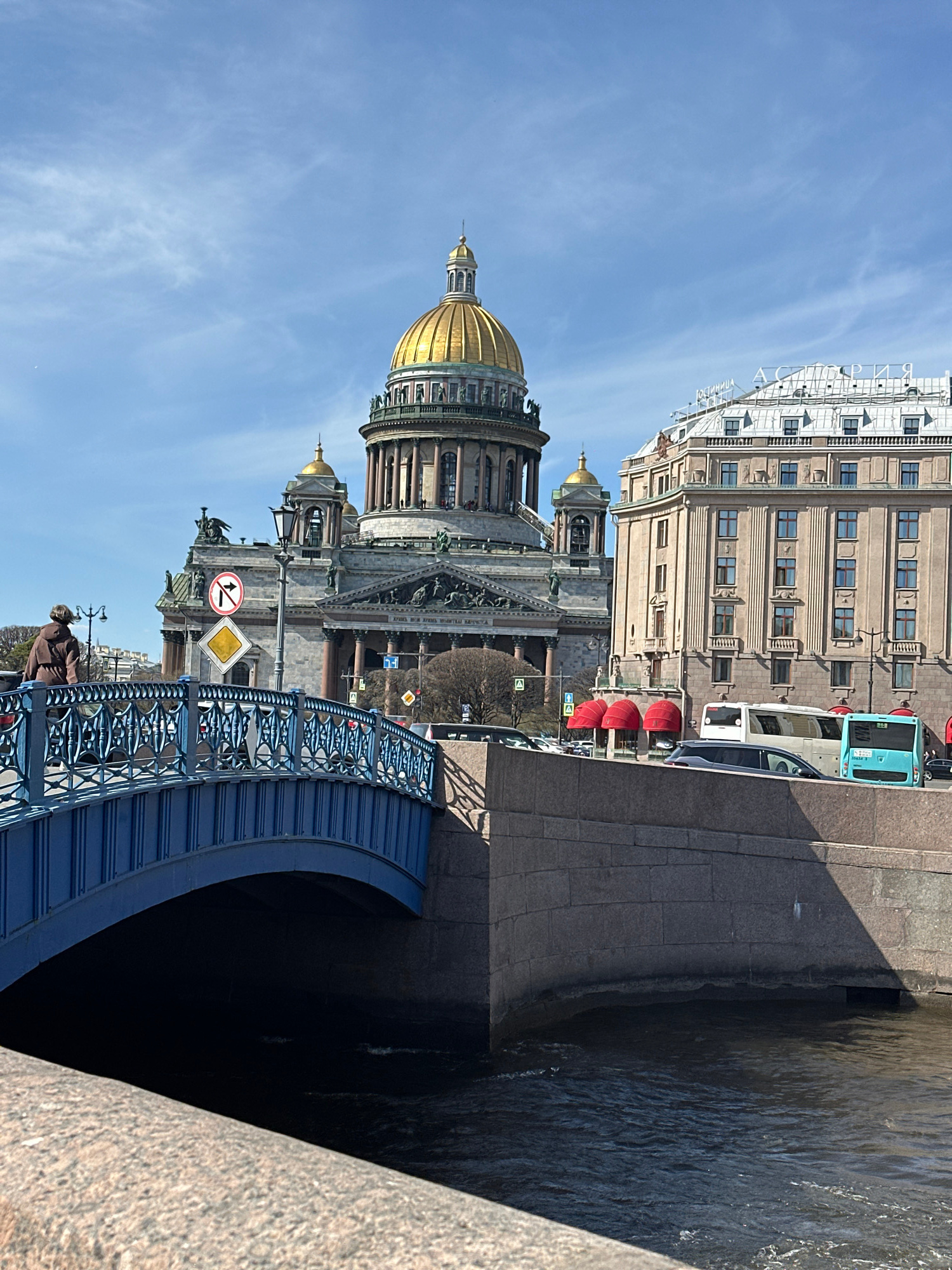 The image, taken in Saint Petersburg, Russia, depicts a vibrant cityscape under a clear blue sky with faint wisps of clouds. In the foreground, a person in a dark coat stands on a bridge, which featur…read more