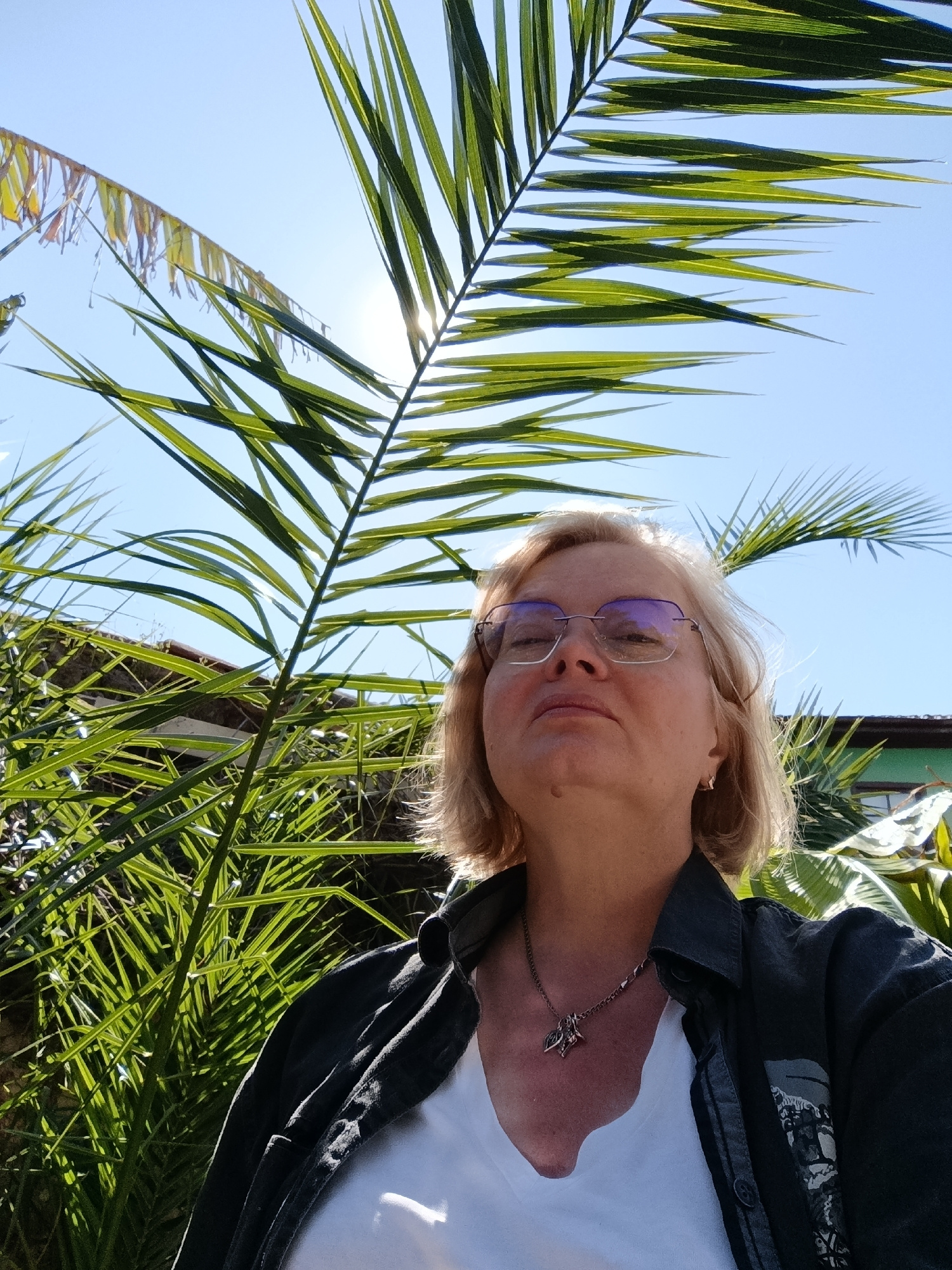A medium shot captures a fair-skinned woman with short, light blonde hair and glasses, positioned against a vibrant, sunlit backdrop of palm fronds and foliage. The woman is wearing a white t-shirt an…read more