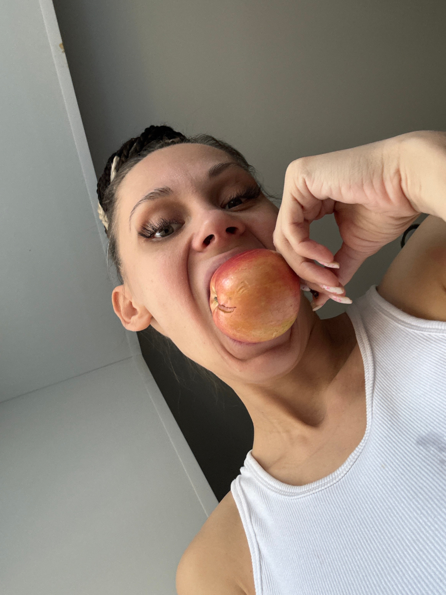 A woman with braided hair is holding an apple in her mouth. She is wearing a white ribbed tank top. The background appears to be a wall painted in a shade of light gray. The image is taken from a low…read more