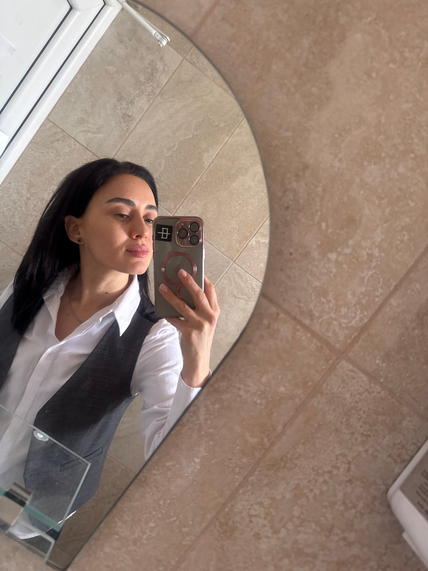 The image is a selfie taken in a bathroom mirror. A woman with dark hair is holding a phone with a rose-gold case and a Chinese character sticker in the upper left corner. She is wearing a white shirt and a dark gray vest. The bathroom has beige tile walls and a white door frame. The location cannot be determined from the image. | Open Wire