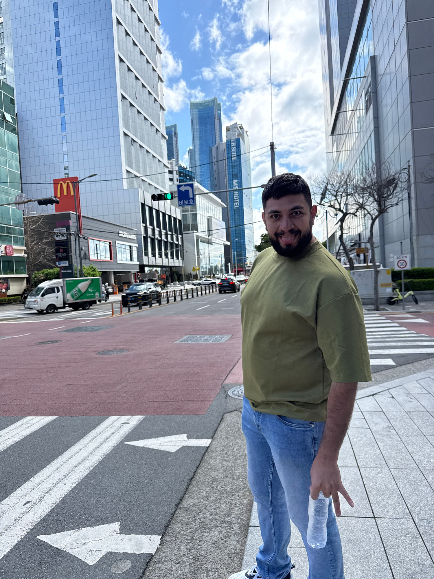 A man stands on a pedestrian walkway beside a street in Busan, South Korea. The street features a bicycle lane, traffic lights, multiple vehicles, and buildings. A McDonald's sign is visible. The man…read more