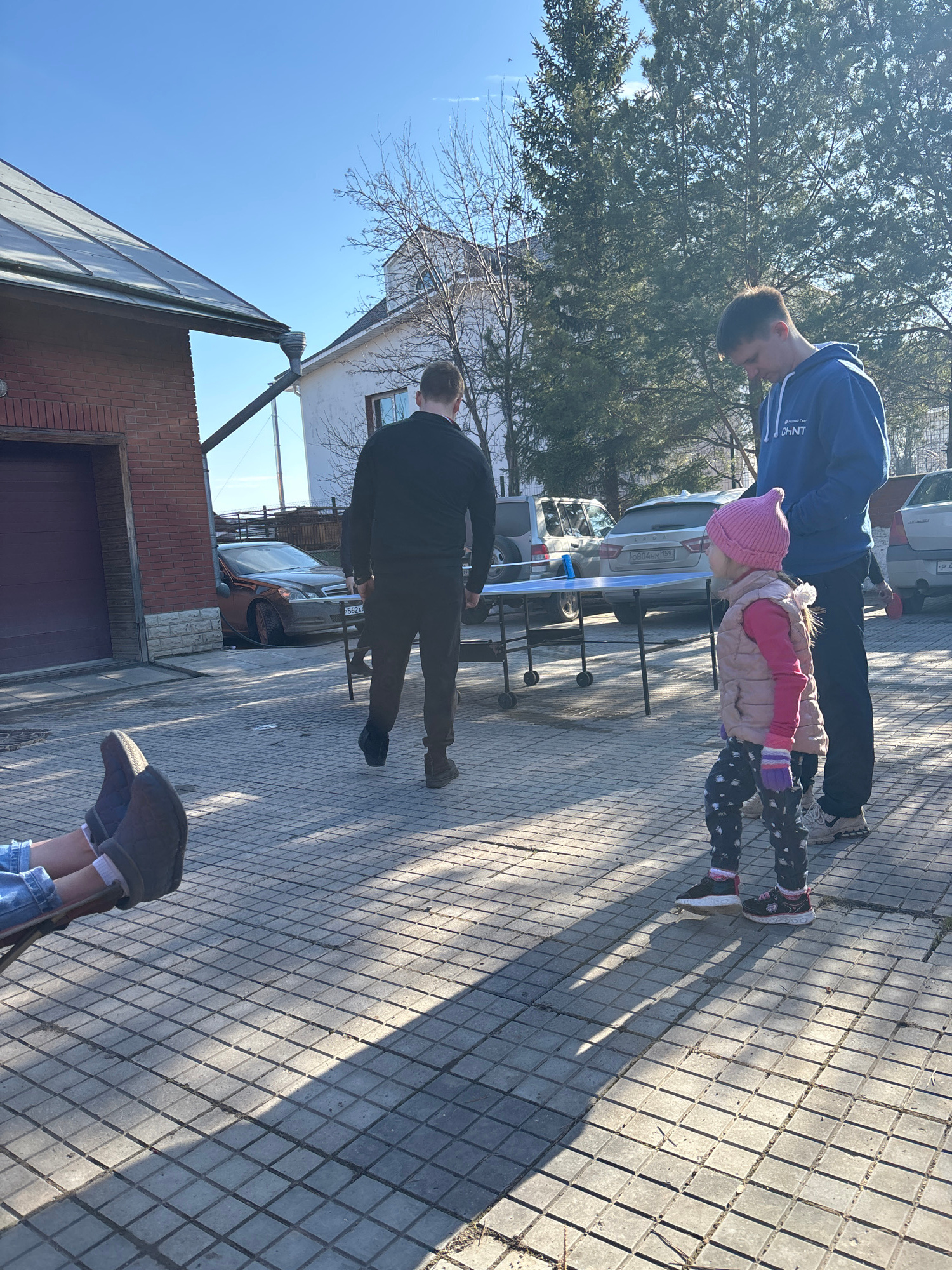 The image captures an outdoor residential scene on a clear, sunny day in the city of Ферма, Russia, characterized by strong shadows cast across the ground. The foreground consists of grey square pavin…read more