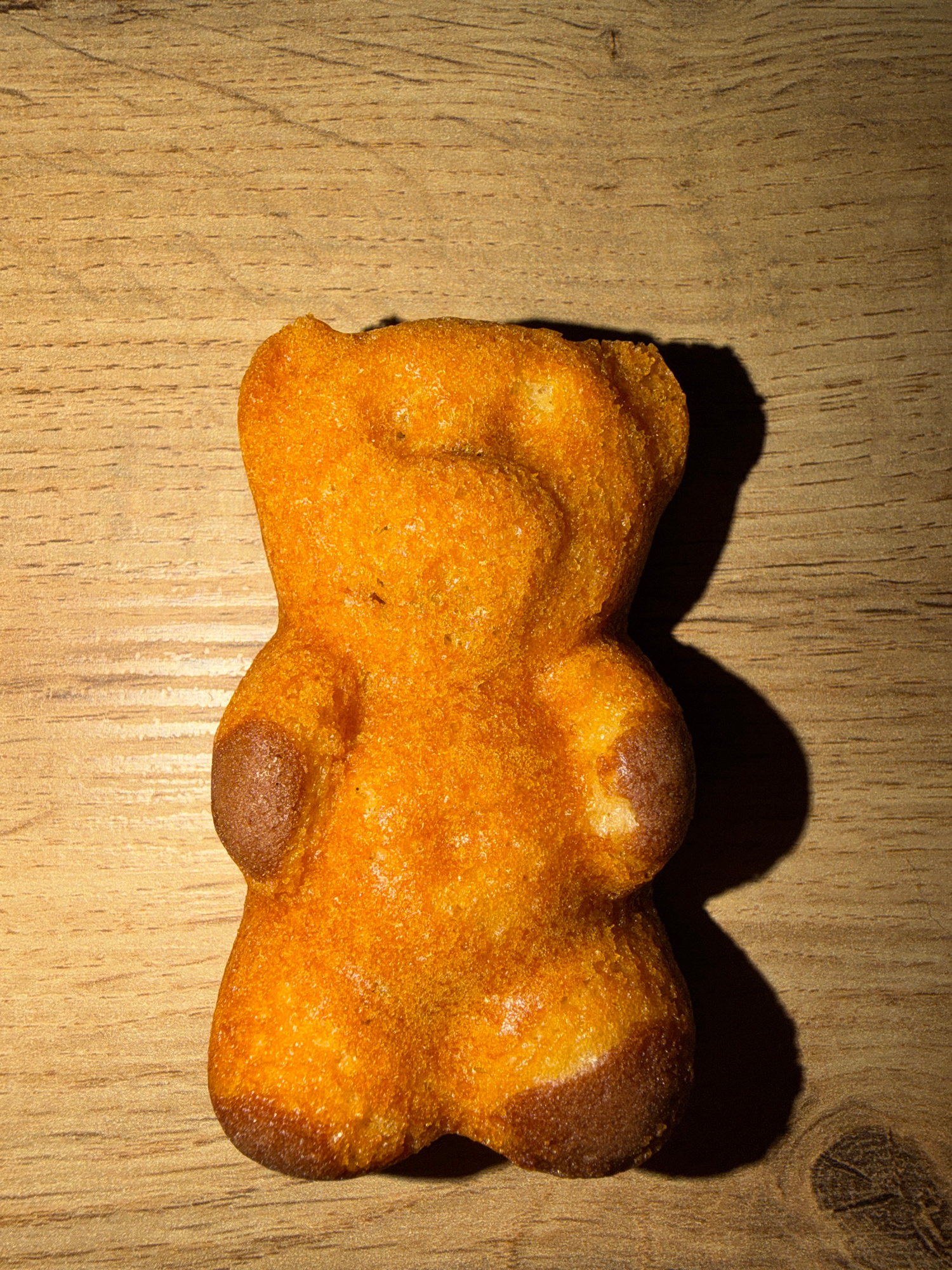 A close-up, still life photograph captures a single, golden-brown, irregularly-shaped object on a light-brown, wood-grain surface. The object appears to be a baked good or snack item, with a slightly…read more