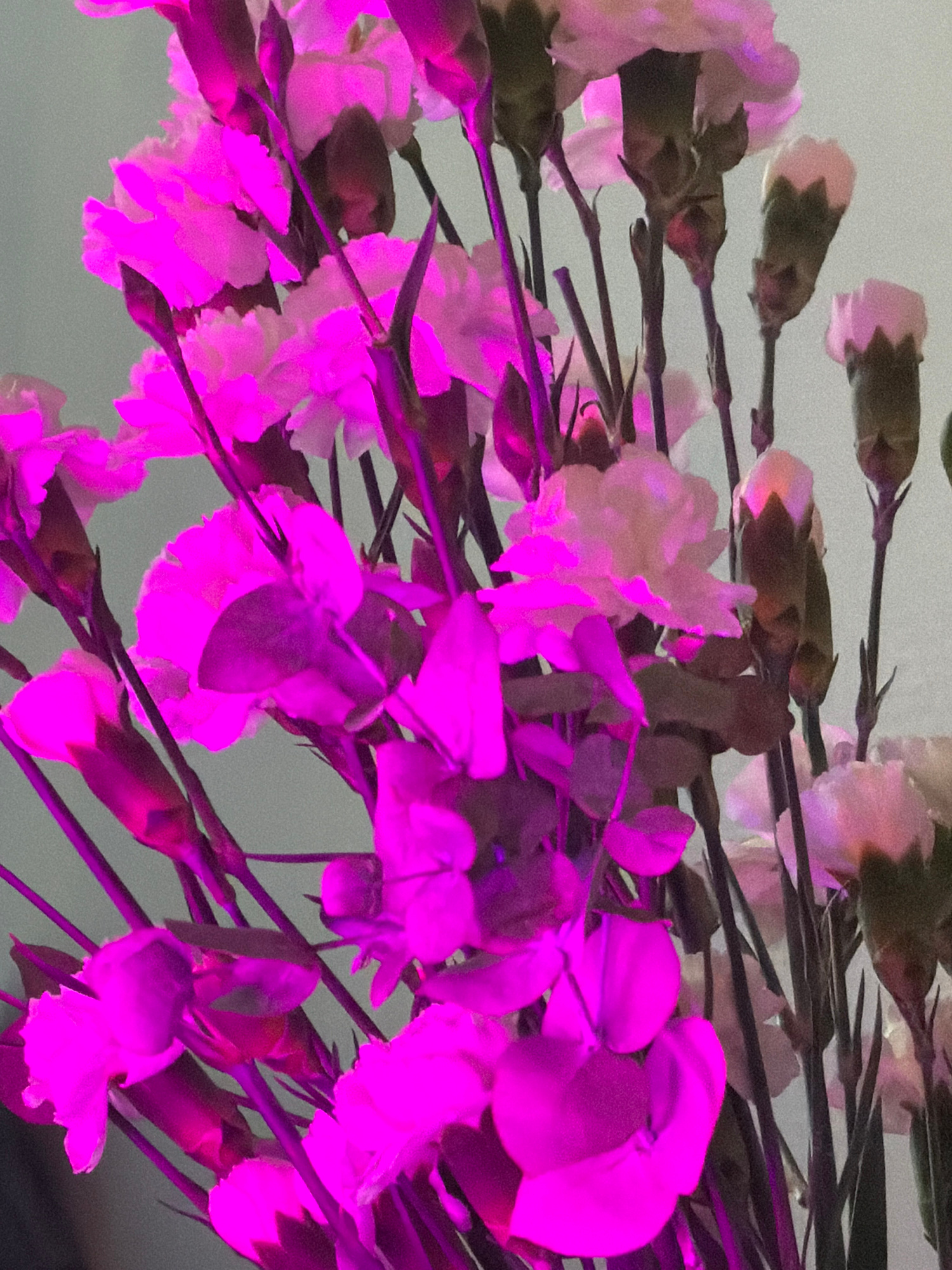 The image shows a close-up of white flowers with pink lighting. The stems are visible, pointing in various directions. The background is a muted gray. The location and further details related to the c…read more