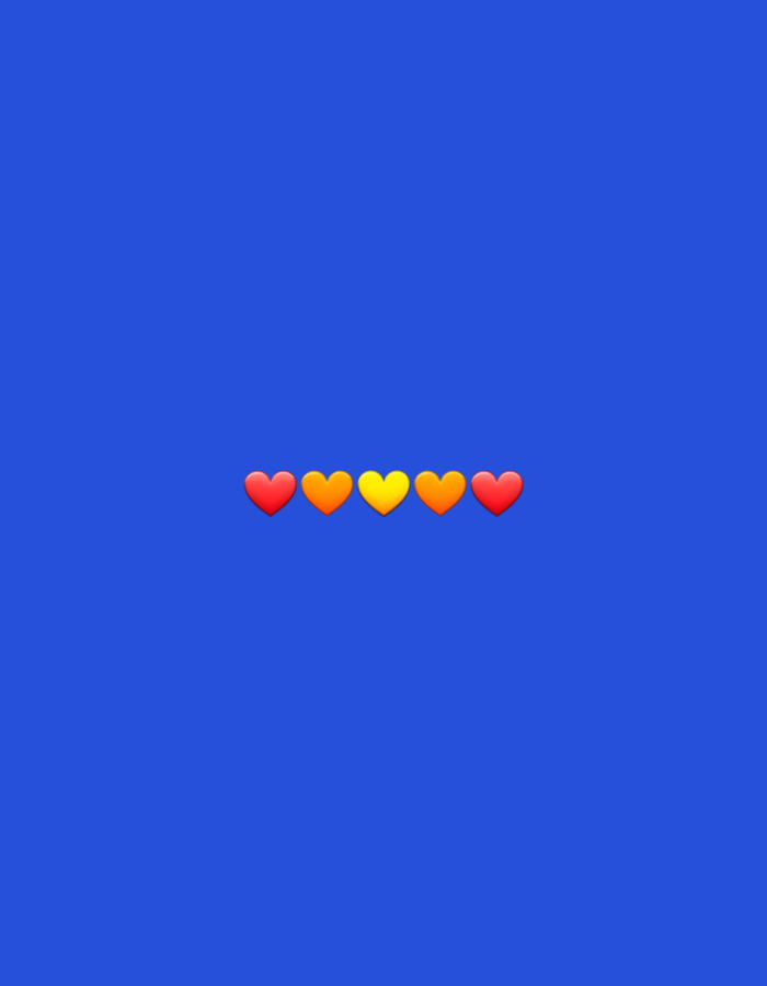 Five emoji hearts are arranged in a line against a solid blue background. From left to right, the colors of the hearts are red, orange, yellow, orange, and red.