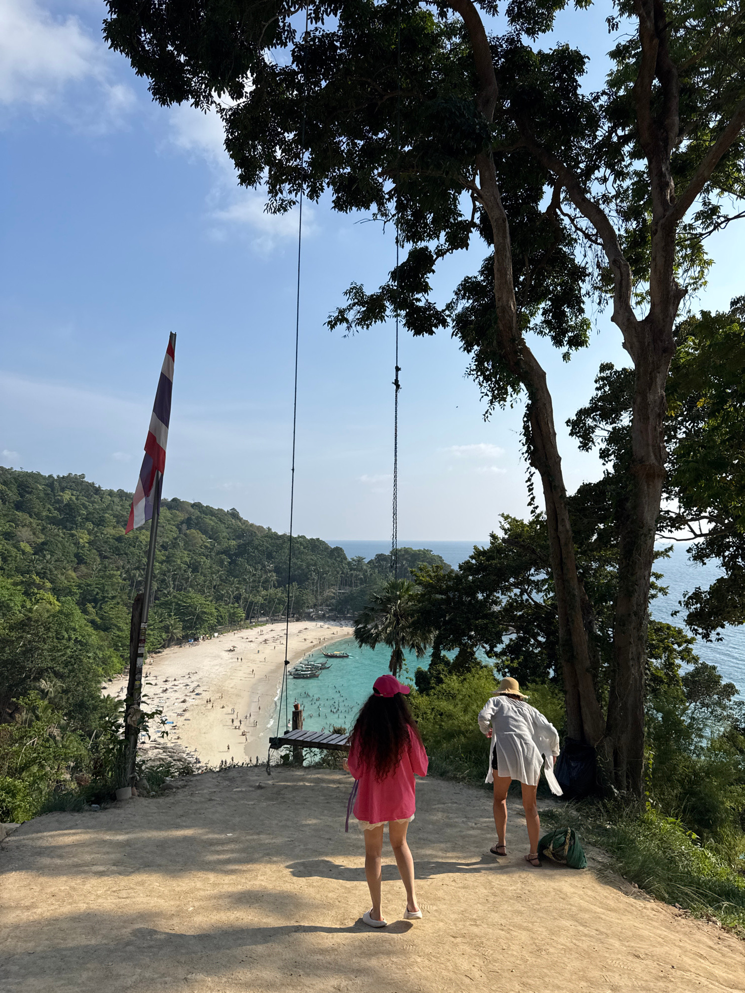 The image shows a scenic view of a beach in Patong, Thailand, from an elevated vantage point. A sandy beach is visible below with numerous people and boats on the water. Above, two women are standing…read more