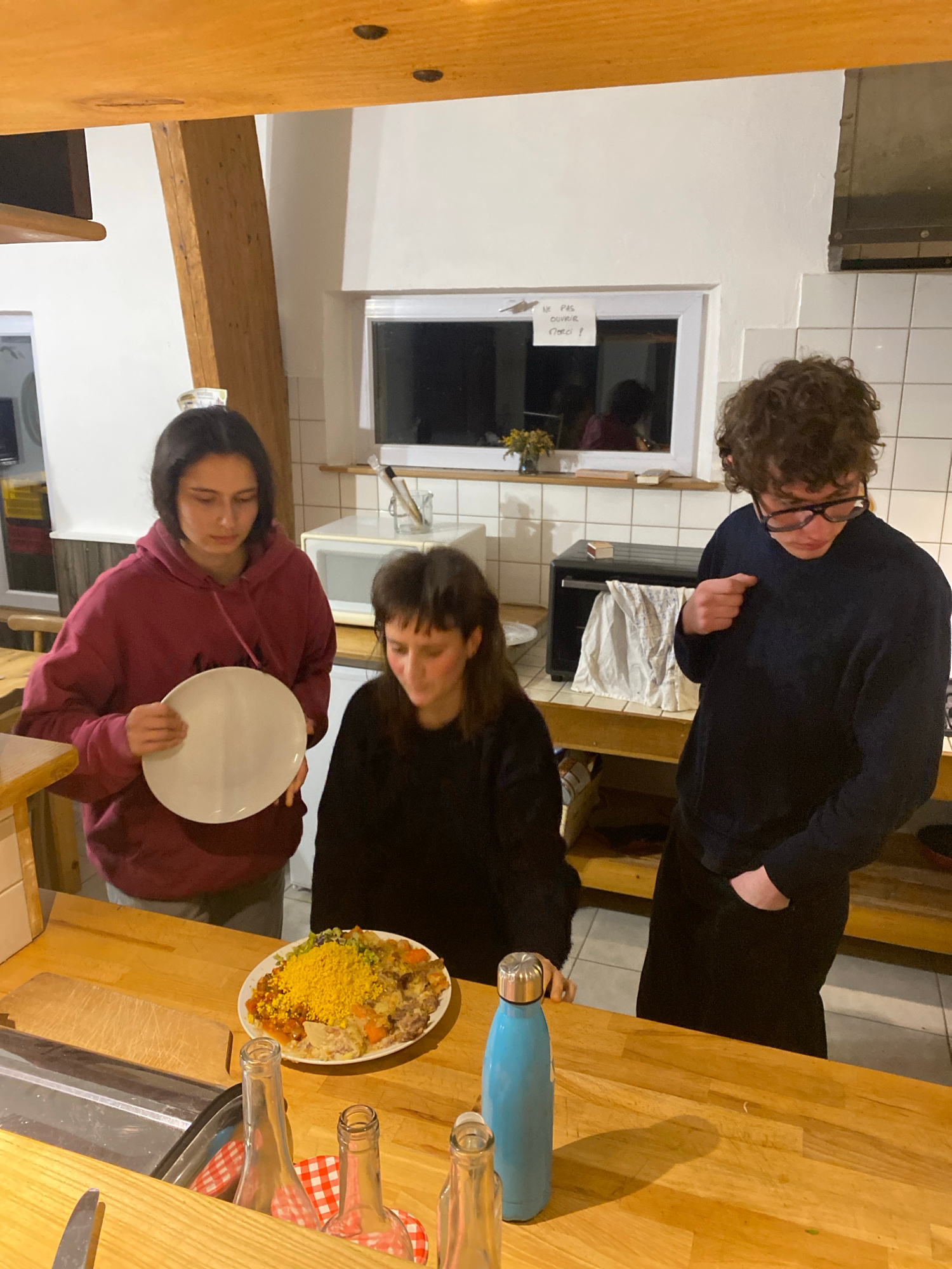 Three people are gathered around a wooden countertop in a kitchen. One person, wearing a dark blue sweater and glasses, stands to the right of a window with a sign taped on it. Another person, in a bl…read more