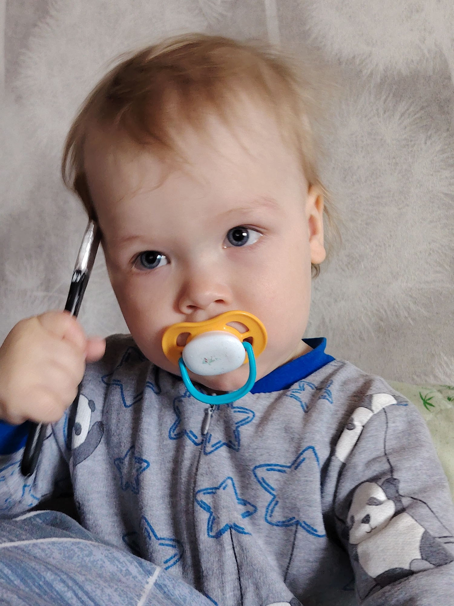 A young, light-skinned child with blond hair and blue eyes is shown from the chest up. The child is holding a black and silver pen against their head near the left temple. The child has a pacifier in…read more