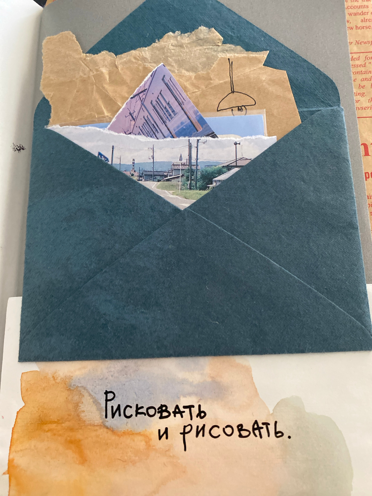 The image displays a collage within an open blue envelope. Inside the envelope are several cut-out pieces of paper including an old newspaper clipping, a torn piece of brown paper with a simple line d…read more