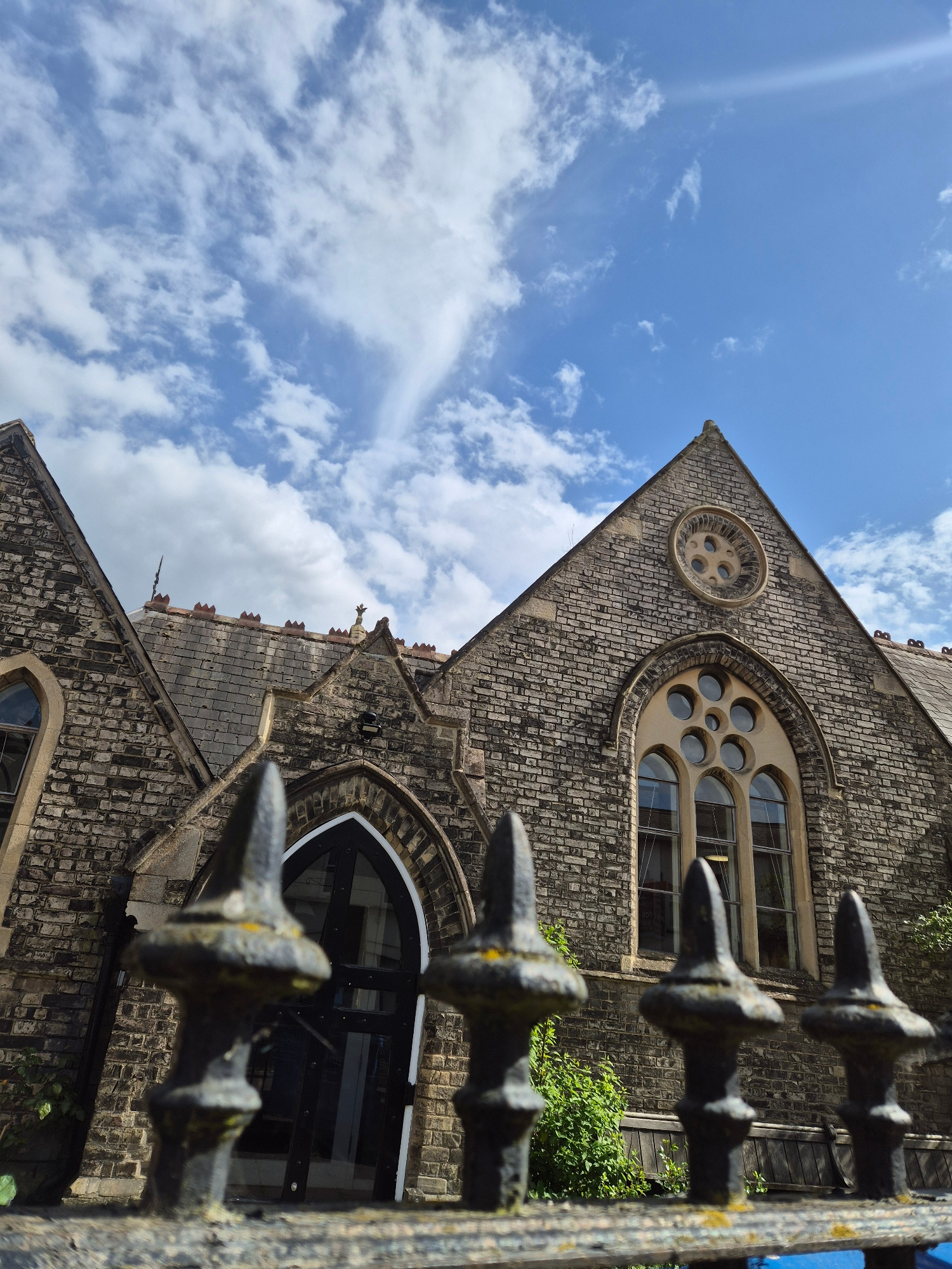The image shows a building in West Suffolk, United Kingdom, viewed from a low angle through a metal fence. The building appears to be a stone structure, possibly a church or similar historical buildin…read more