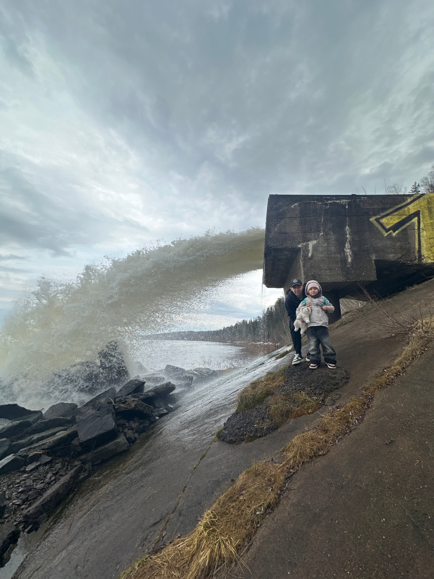 Two individuals, an adult and a child, are standing near a dam in Noviy, Russia. The child is holding a stuffed animal. Water is flowing over the dam, creating a waterfall effect. The sky is overcast.…read more
