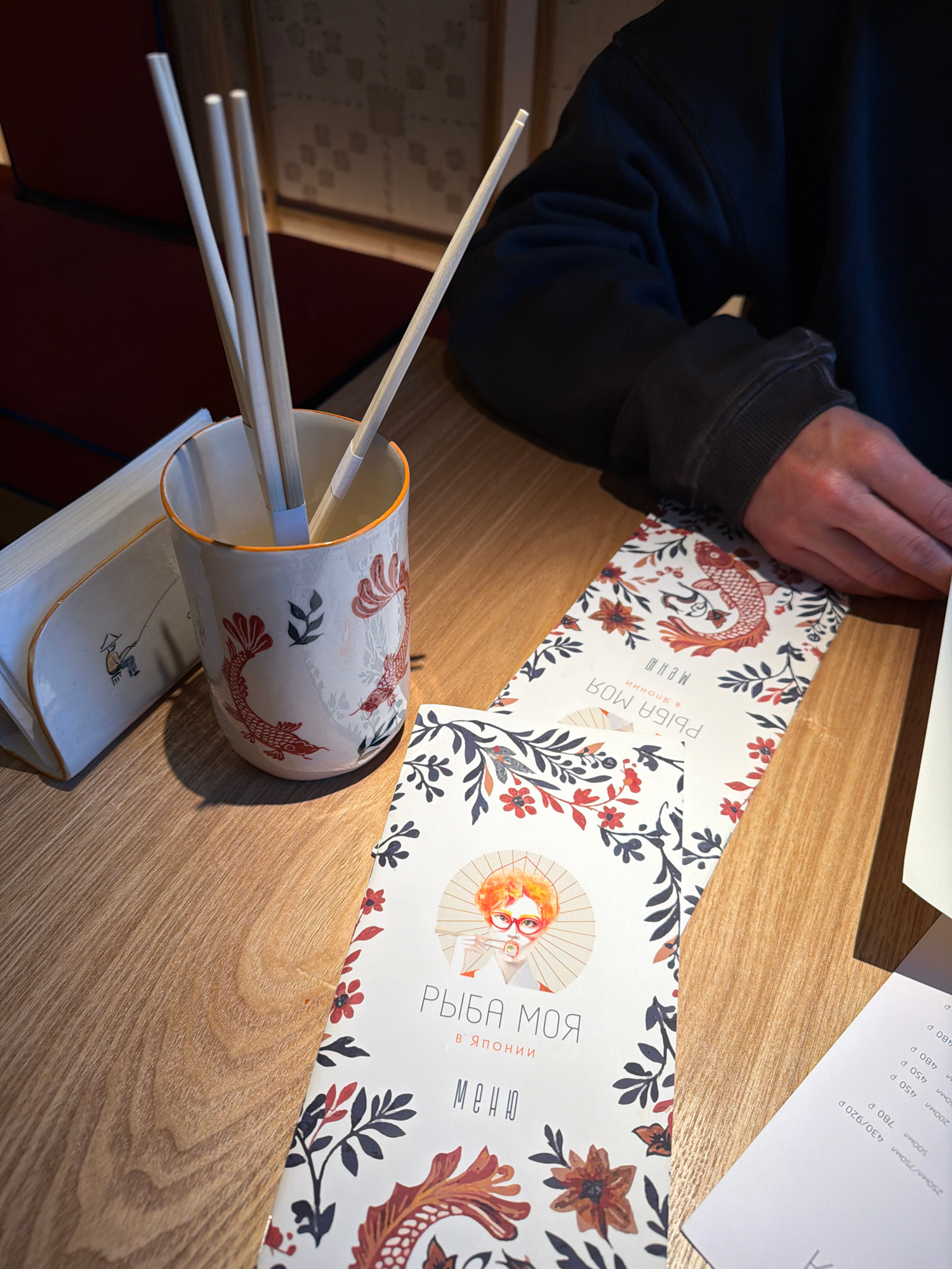 Here's a matter-of-fact description of the image: A photograph taken at eye level depicts a table setting, likely in a restaurant. A person with a dark, cuffed jacket is visible on the left side, wit…read more