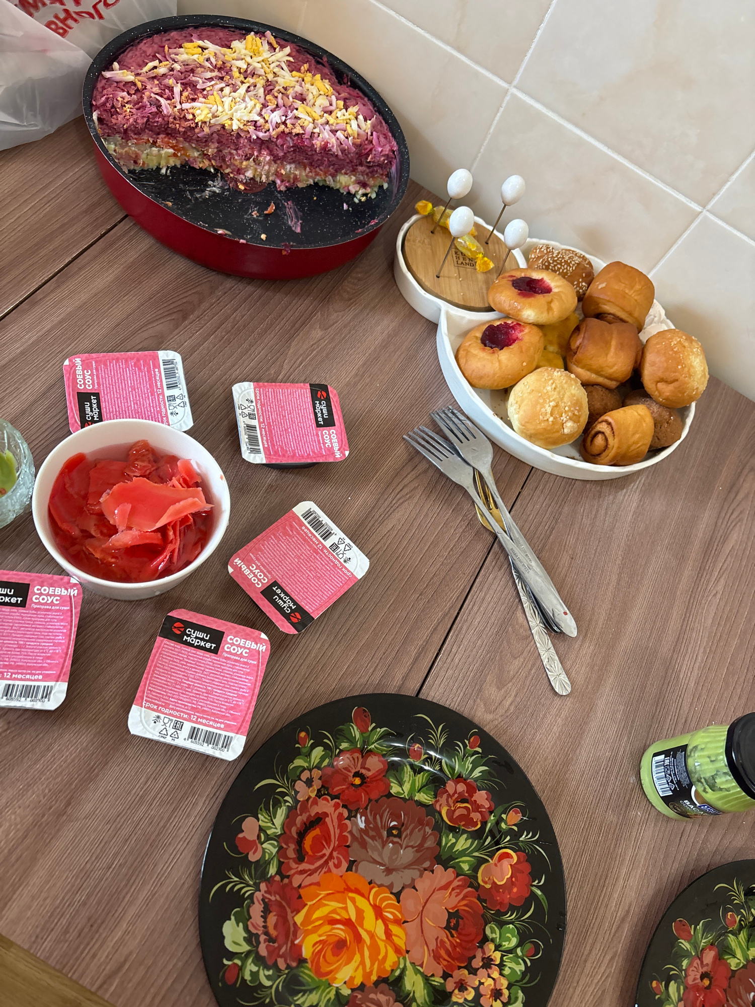 The image depicts a tabletop scene with various food items and utensils. A white plate holds an assortment of pastries, including buns with sesame seeds, filled donuts, and cinnamon rolls. Nearby areβ¦read more