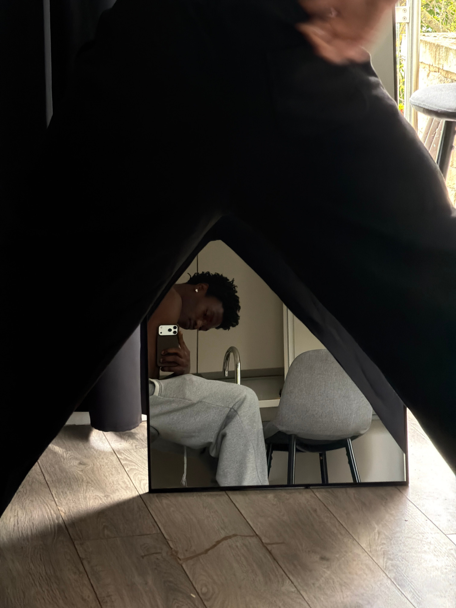 A low-angle, indoor photograph captures a reflection in a rectangular mirror, partially obscured by a large, dark, out-of-focus object that dominates the foreground, likely a leg clad in dark trousers…read more