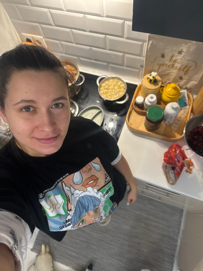 The image depicts a kitchen scene in Odintsovo, Russia, taken from an elevated perspective, likely a selfie. A female subject, appearing to be an adult, is centered in the lower half of the frame. She…read more