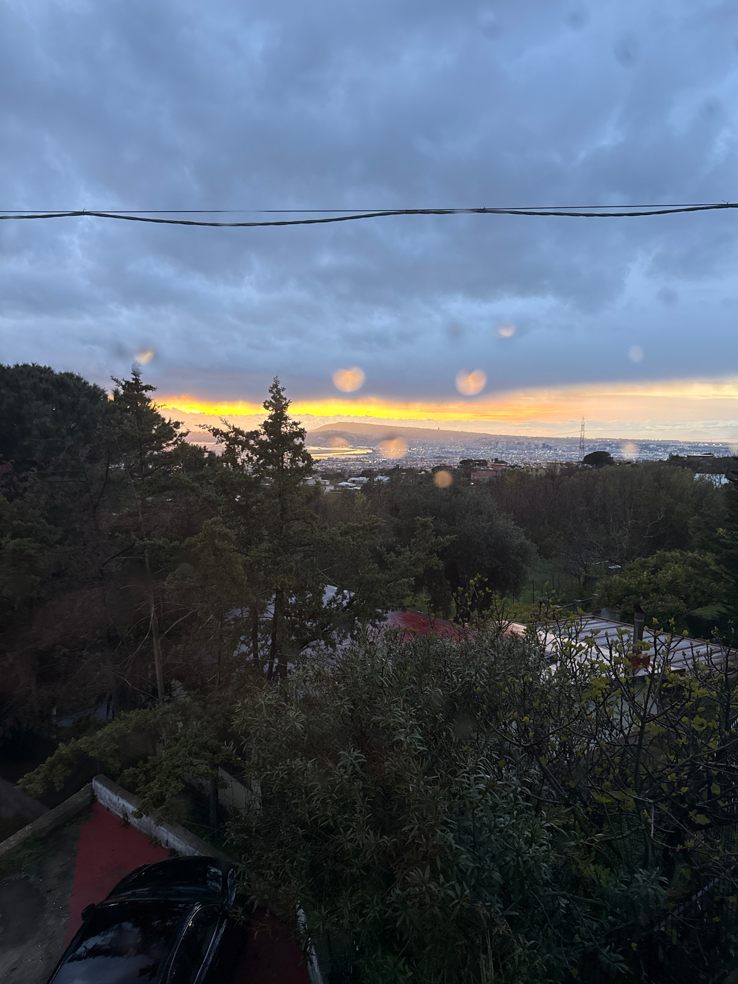 The image presents an elevated, wide-angle view of a landscape encompassing an urban area, a bay, and distant mountains under a heavily clouded sky at either sunrise or sunset. The scene is observed fâŚread more