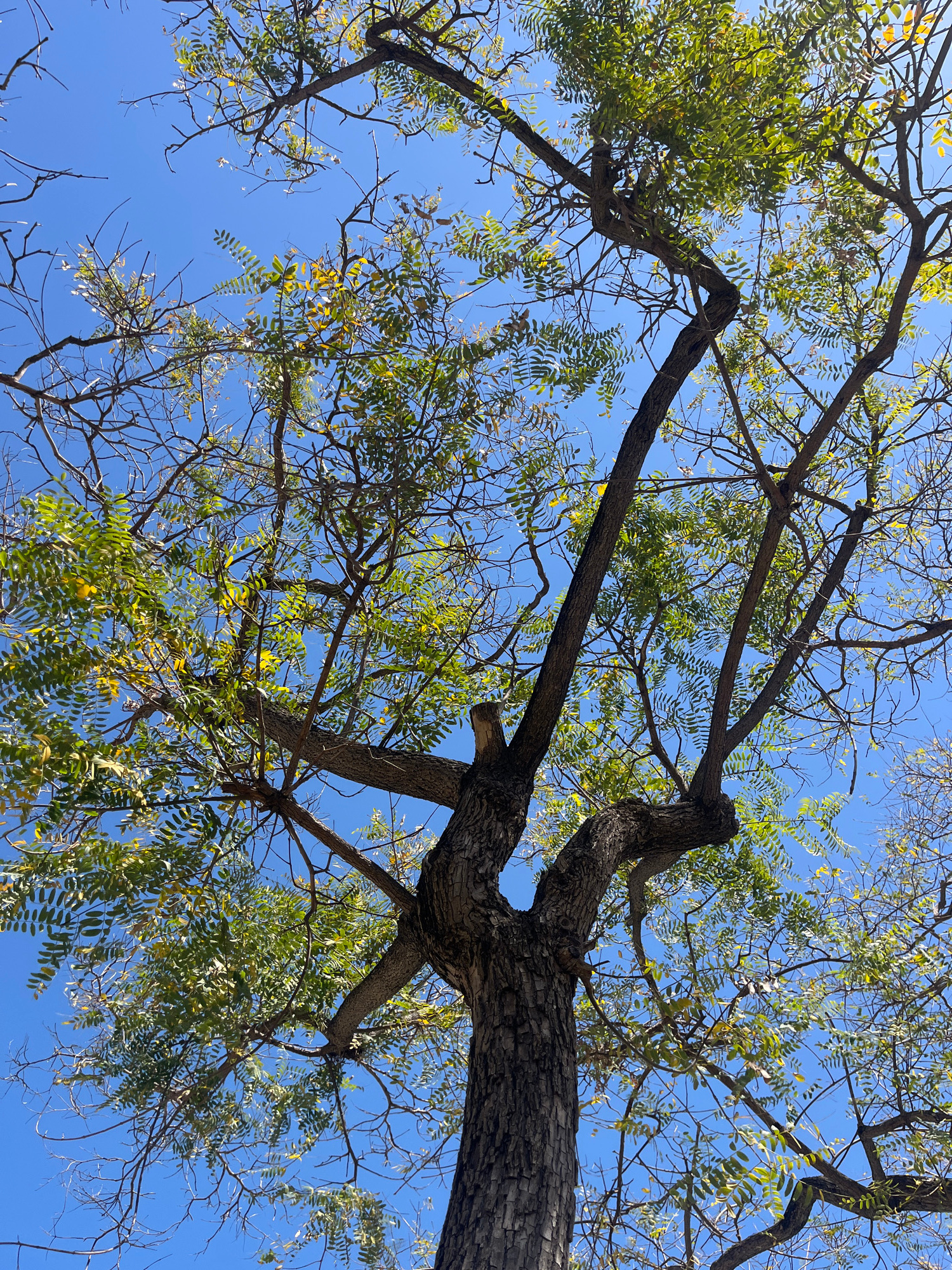 The image presents a worm's-eye view looking up into the canopy of a large tree against a clear, vibrant blue sky. The main subjects are the tree's trunk, its sprawling branches, and numerous small, c…read more