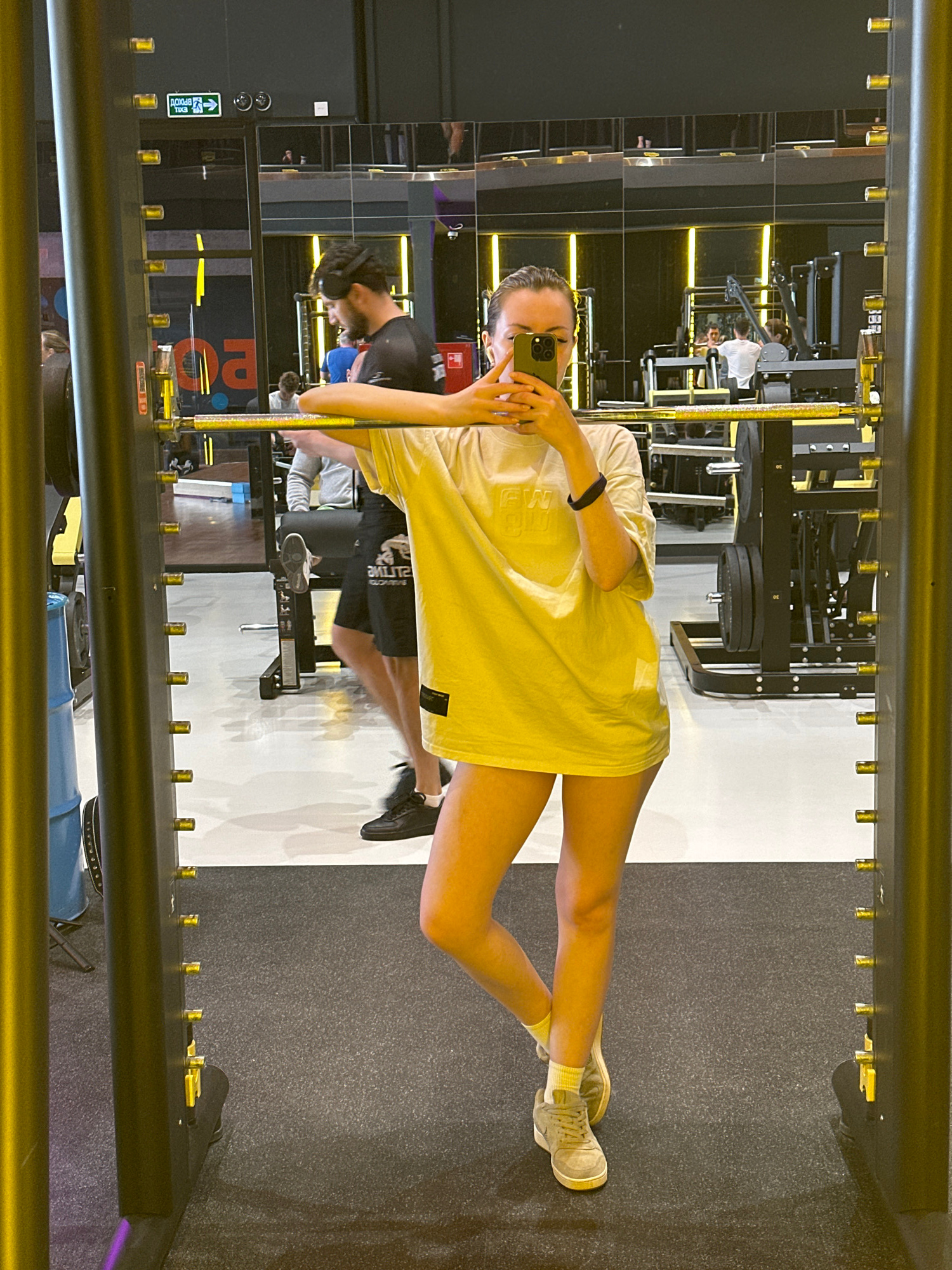 A young woman is taking a selfie in front of a mirror in a gym, likely located in Khimki, Russia. She is wearing a yellow t-shirt, light-colored socks, and sneakers. Her phone is visible in her hand.…read more