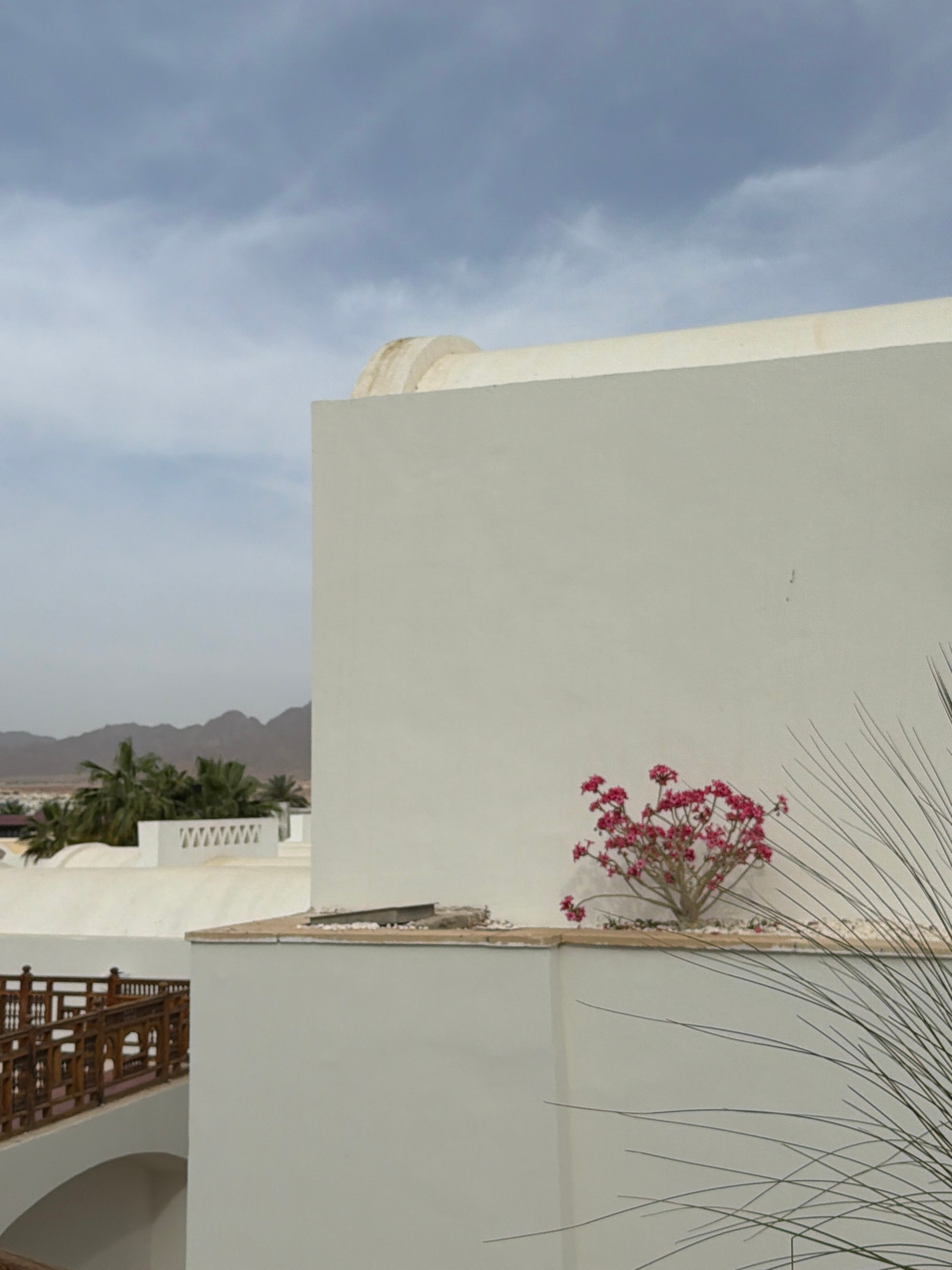 The image depicts a partial view of a building, likely in Sharm El Sheikh, Egypt, given the presence of palm trees and a desert mountain range in the background. The building is white with a protrudin…read more