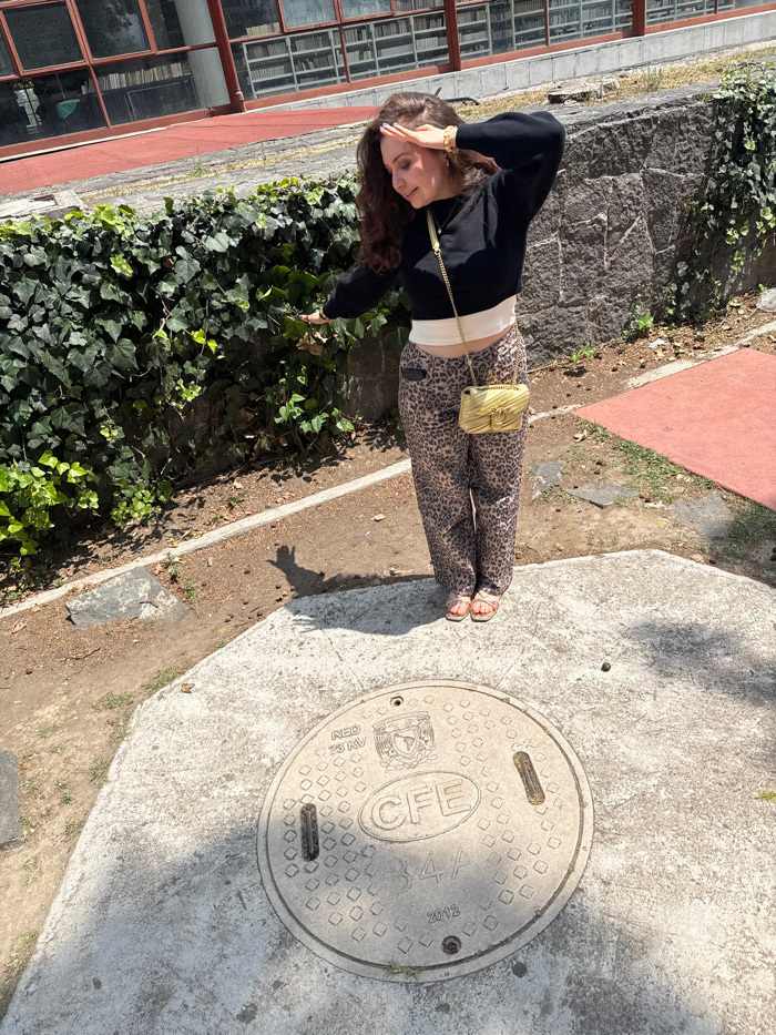 An outdoor scene captures a young adult female on the campus of Universidad Nacional Autónoma de México (UNAM) in Ciudad Universitaria, Mexico City. She stands on a light grey concrete slab, positioned directly above a circular concrete manhole cover that features embossed text: "RED 23 KV," the UNAM shield logo, "CFE," "34A," and "2012." The female, possessing long dark wavy hair, is attired in a black cropped long-sleeve top over a white undergarment, leopard print pants, and light-colored flat sandals. She wears a gold chain necklace, a gold bracelet on her left wrist, and carries a small, quilted, gold-toned cross-body bag with a chain strap. Her right hand is raised to her forehead, seemingly shielding her eyes, while her left hand is extended forward towards a dense wall of green ivy covering a rough-hewn stone wall behind her. In the background, a multi-story academic building with large, angled glass windows displays rows of bookshelves within, indicating a library or educational facility. The surrounding ground consists of dirt paths, dry soil, and a narrow reddish-brown paved strip. The scene is brightly illuminated by daylight, casting the woman's shadow to her right on the concrete surface. | Open Wire