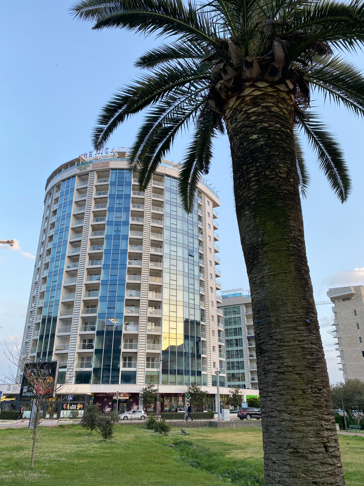 The image captures a tall, modern building in Budva, Montenegro. Its facade is predominantly glass, reflecting the surrounding environment and the sky above. The building has numerous balconies. Adjac…read more