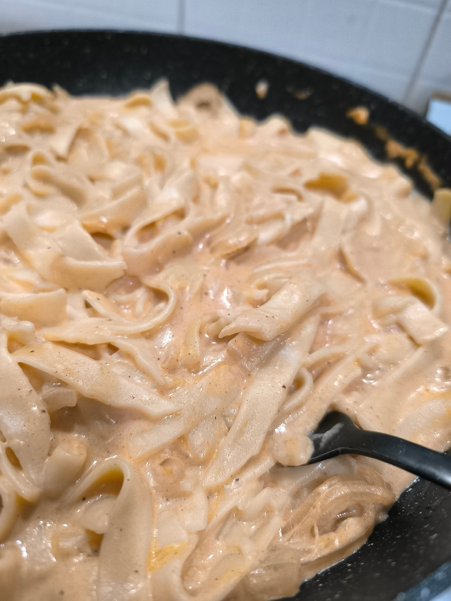 The image shows a close-up of a pan filled with fettuccine pasta in a creamy sauce. A black serving spoon is partially visible, submerged in the pasta. The environment suggests a domestic kitchen sett…read more