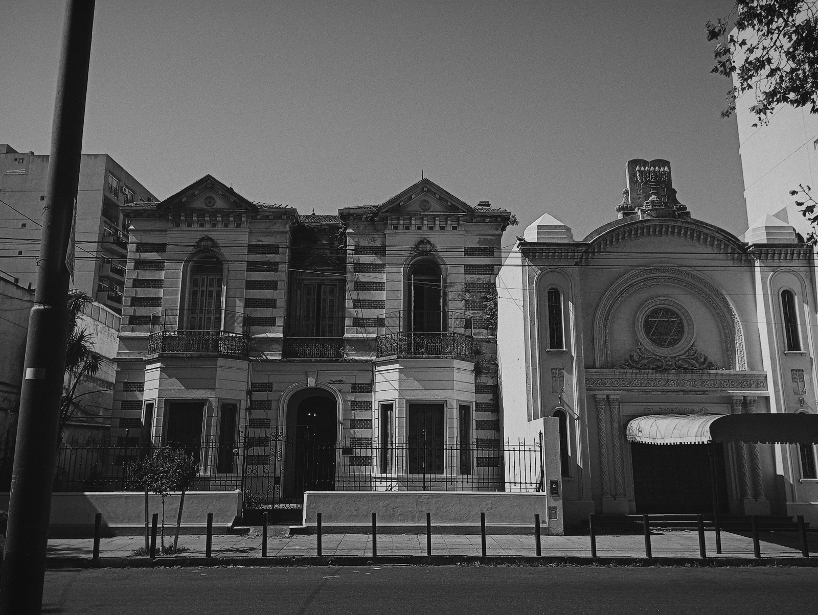 A black and white street scene captures a row of buildings under a clear sky during daylight hours. The image is taken from a slightly low angle, looking up at the structures. On the far left, a tall…read more