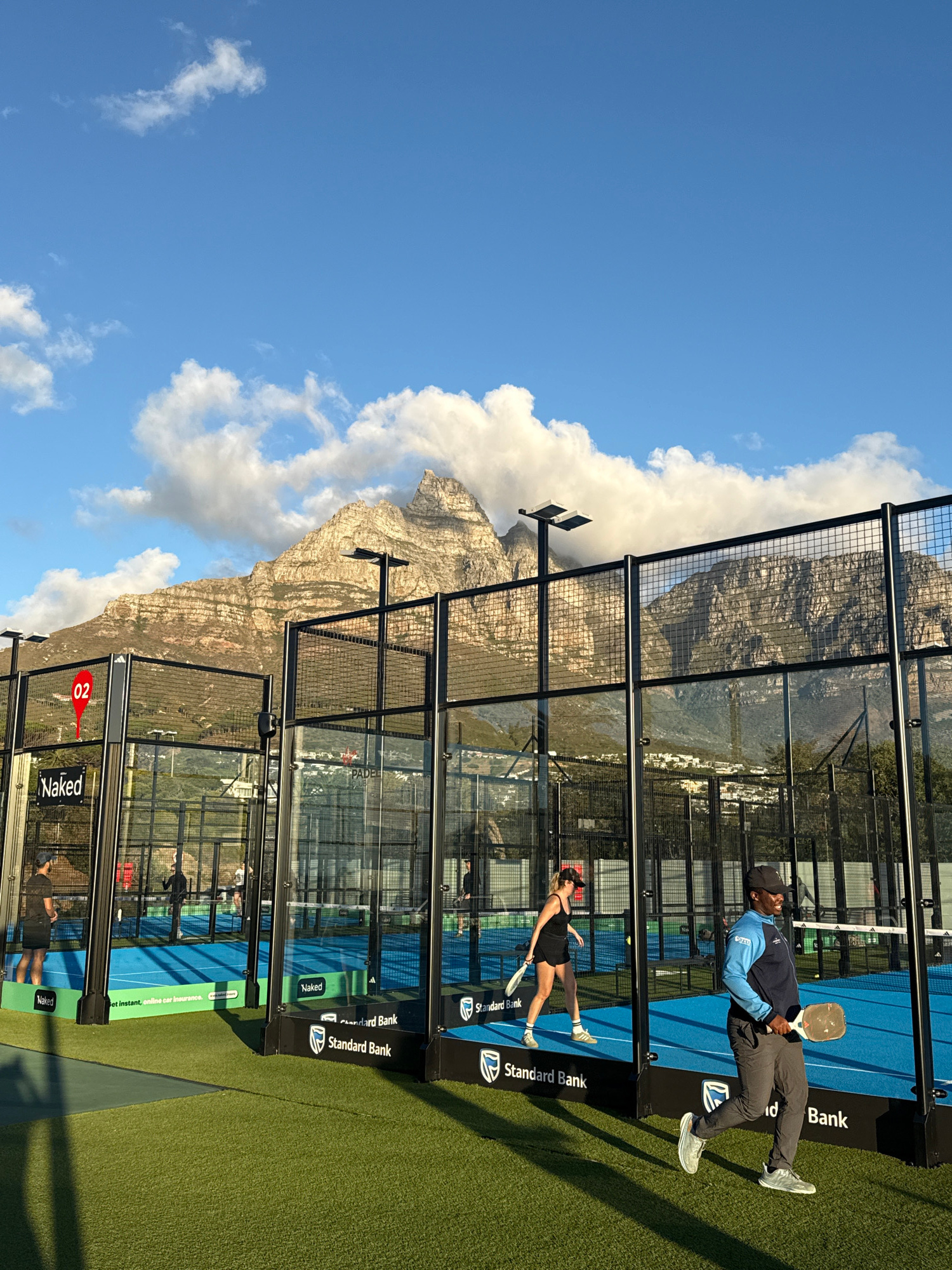 Here is a description of the image: The image shows a paddle tennis court with Table Mountain in the background. Two people are playing paddle tennis, one in a black dress and one in a blue jacket anβ¦read more