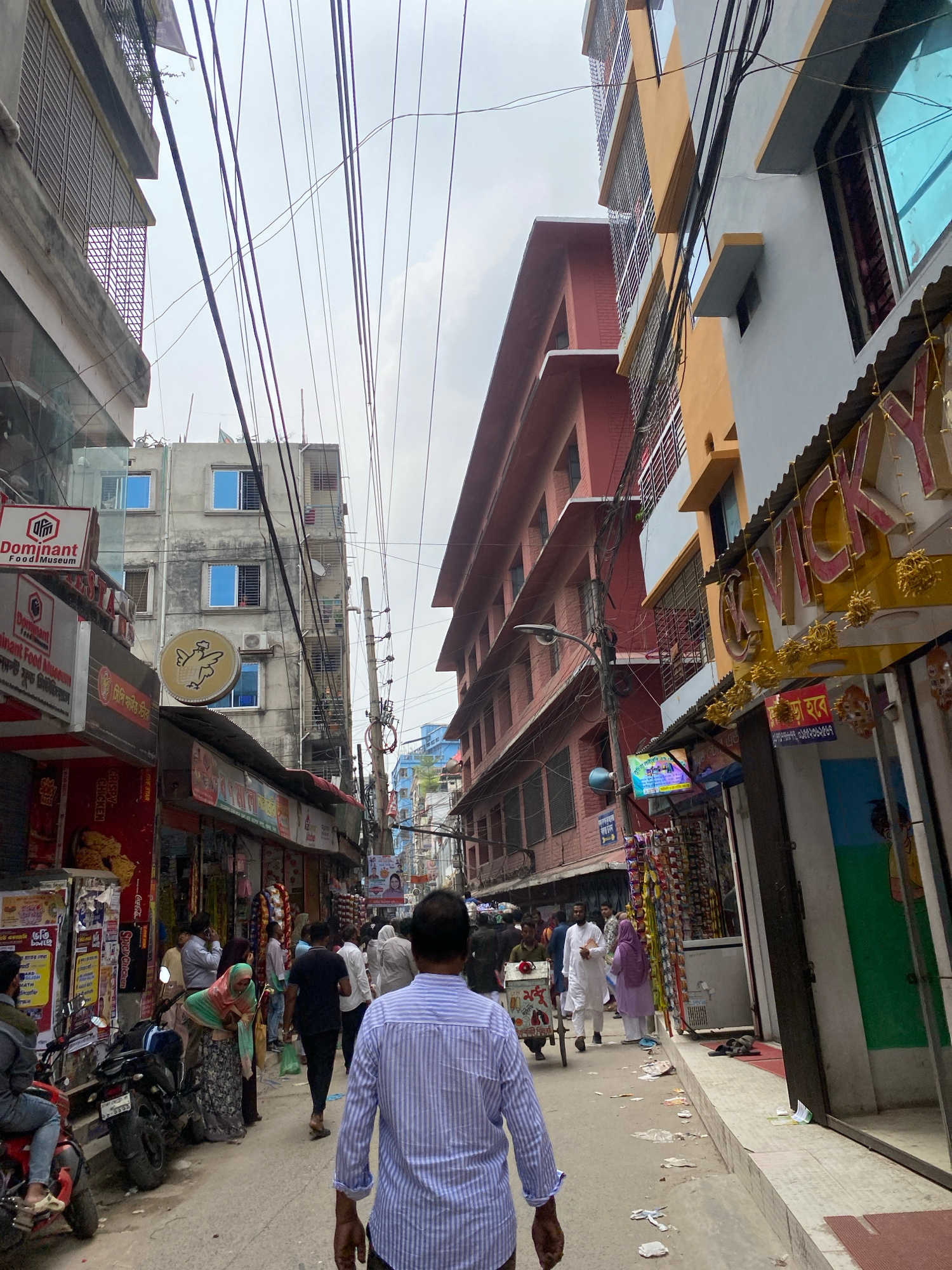 The image shows a street scene in Dhaka, Bangladesh. The view is along a narrow street bordered by buildings of varied height and architectural style. Power lines crisscross above the street. On the r…read more