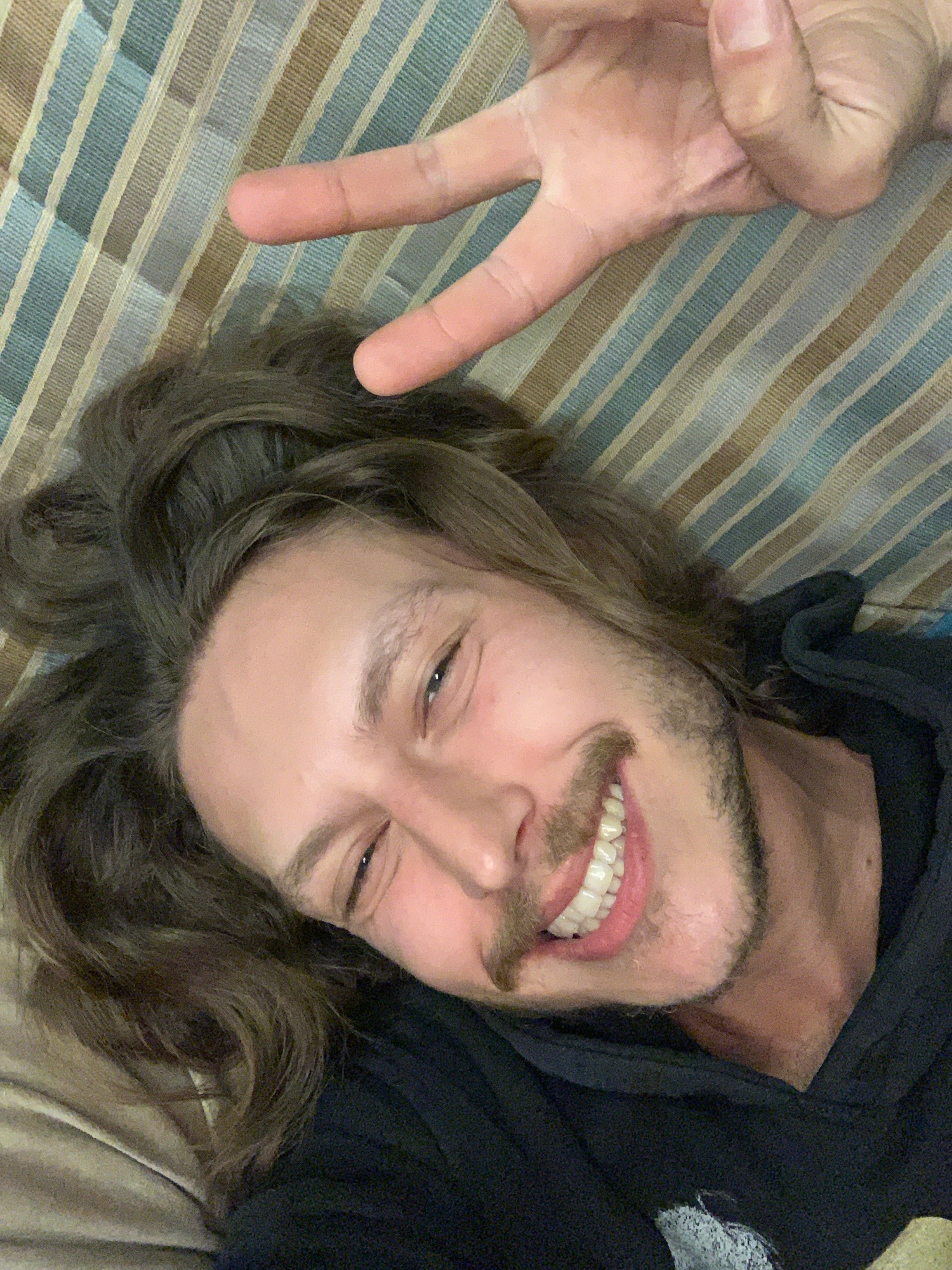 A man is lying on a striped bed or couch, smiling and holding up a peace sign with his left hand. He has shoulder-length brown hair, a mustache, and a slight beard. He is wearing a dark-colored hooded…read more