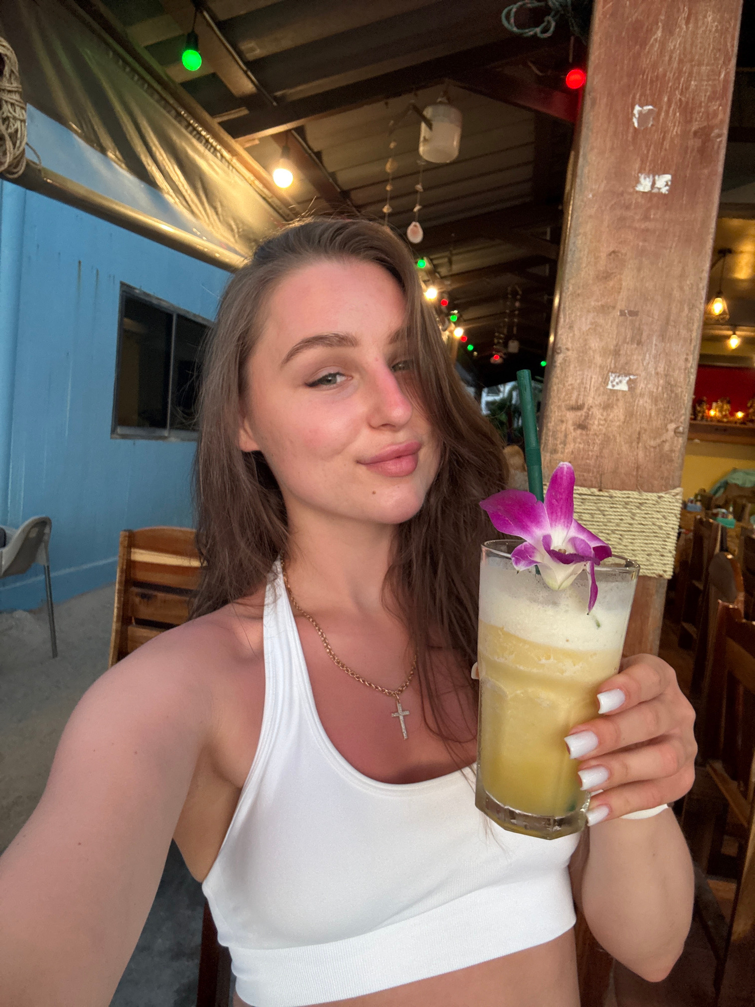 The image shows a woman holding a cocktail in a glass decorated with a purple orchid and a green straw. She is wearing a white tank top and a gold necklace with a cross pendant. The location appears t…read more