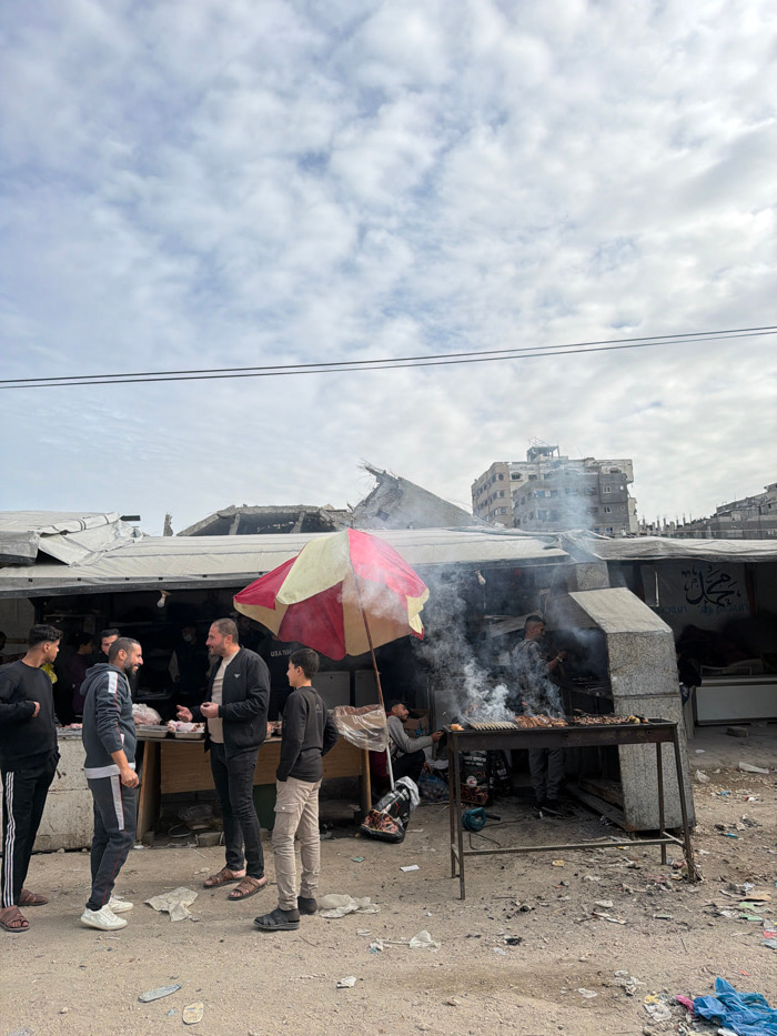 The image depicts an outdoor market scene in Gaza City, Palestinian Territory, against a backdrop of damaged and intact buildings under an overcast sky. In the foreground, three men are engaged in con…read more