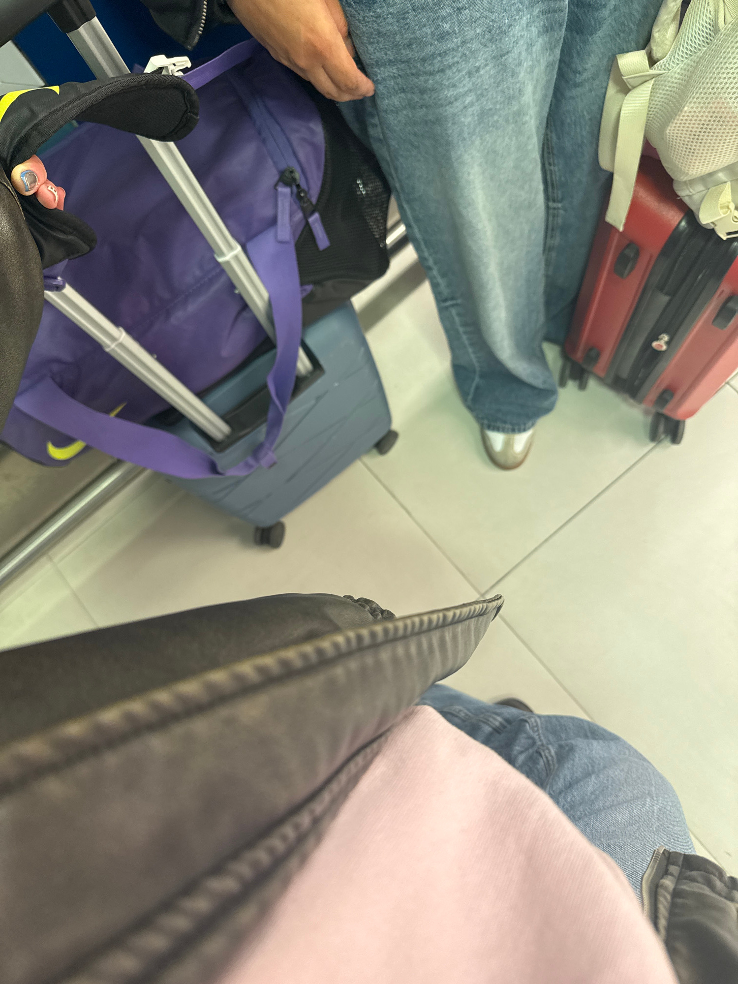 The image shows a view looking down at multiple people and their luggage on a light-colored tiled floor. There is a red suitcase, a blue suitcase, and a purple duffel bag, all likely belonging to the…read more